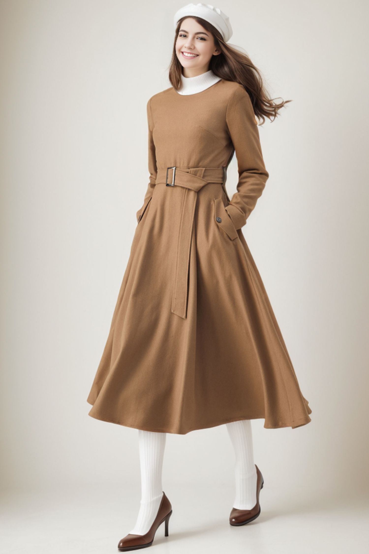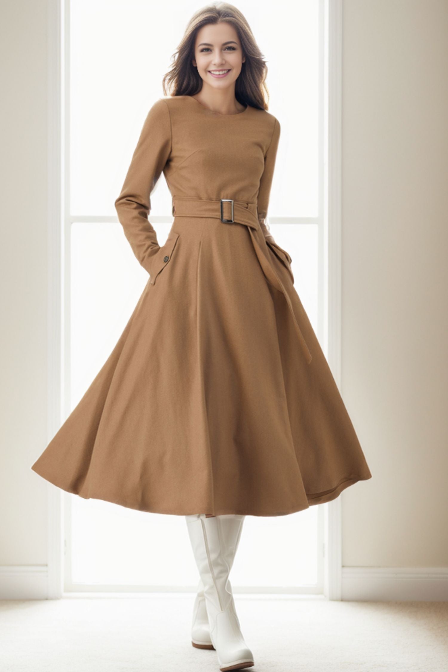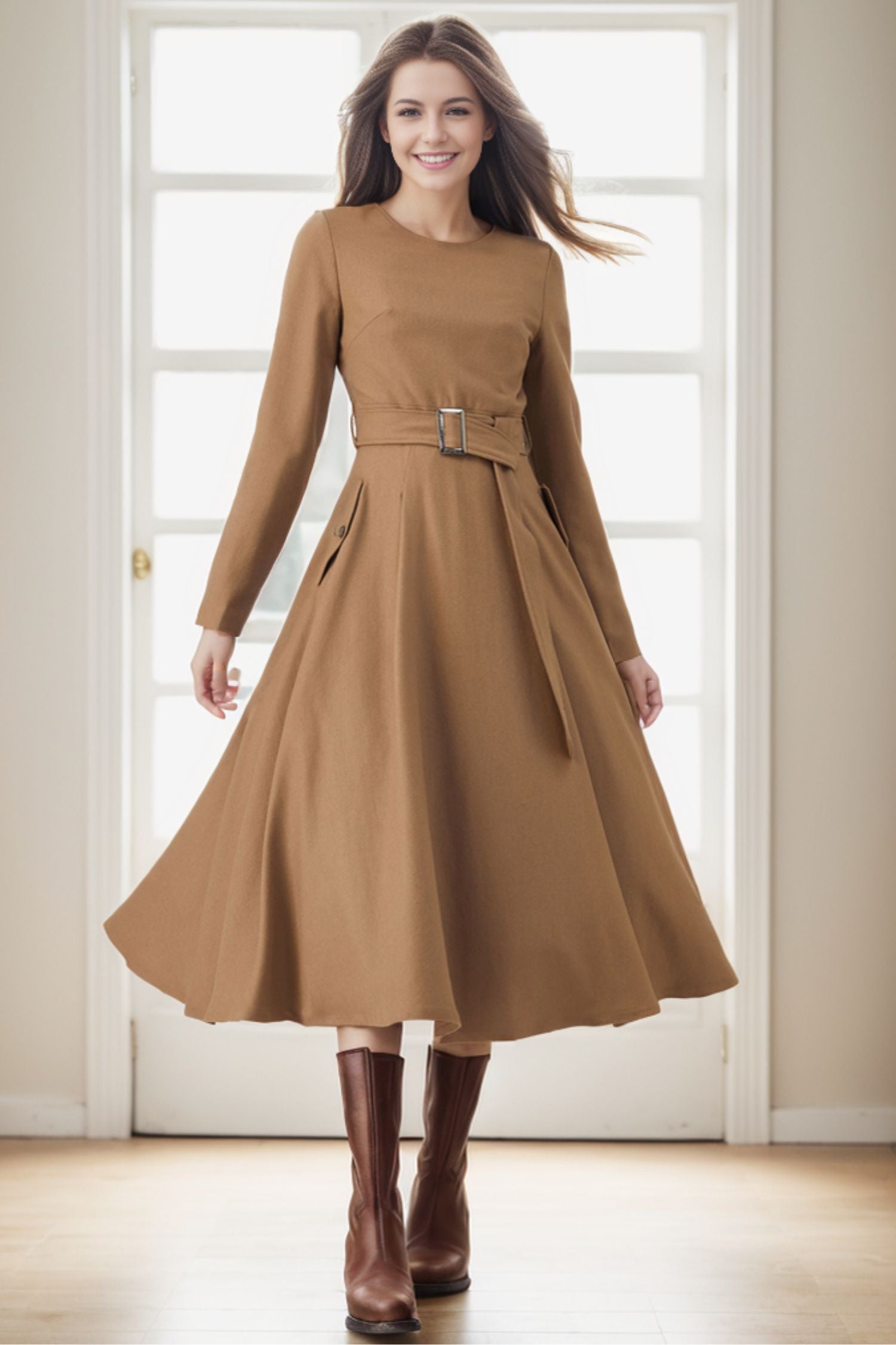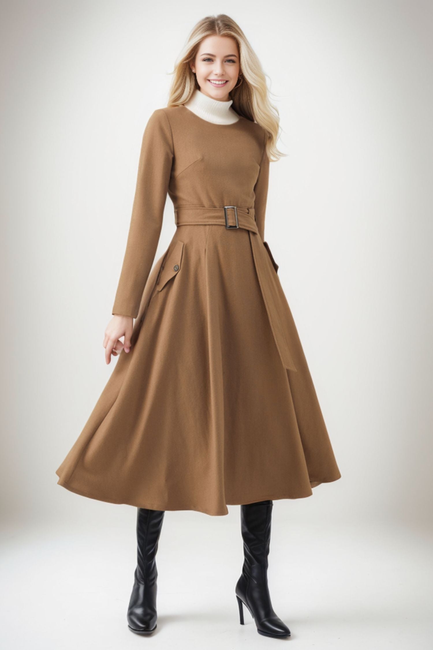 Experience elegance and style with our Midi Wool Belted Fit and Flare Dress! Crafted from luxurious wool, this dress features a flattering fit and flare silhouette and comes with a chic belt for a cinched waist look. Perfect for any occasion, elevate your wardrobe with this must-have piece.