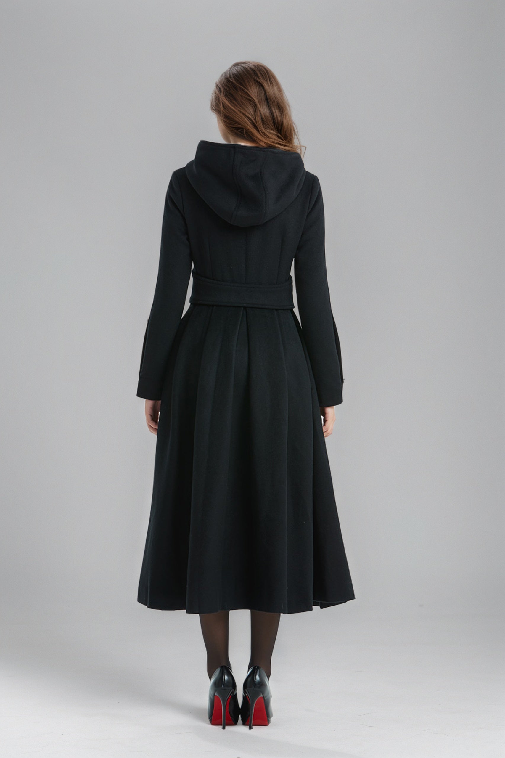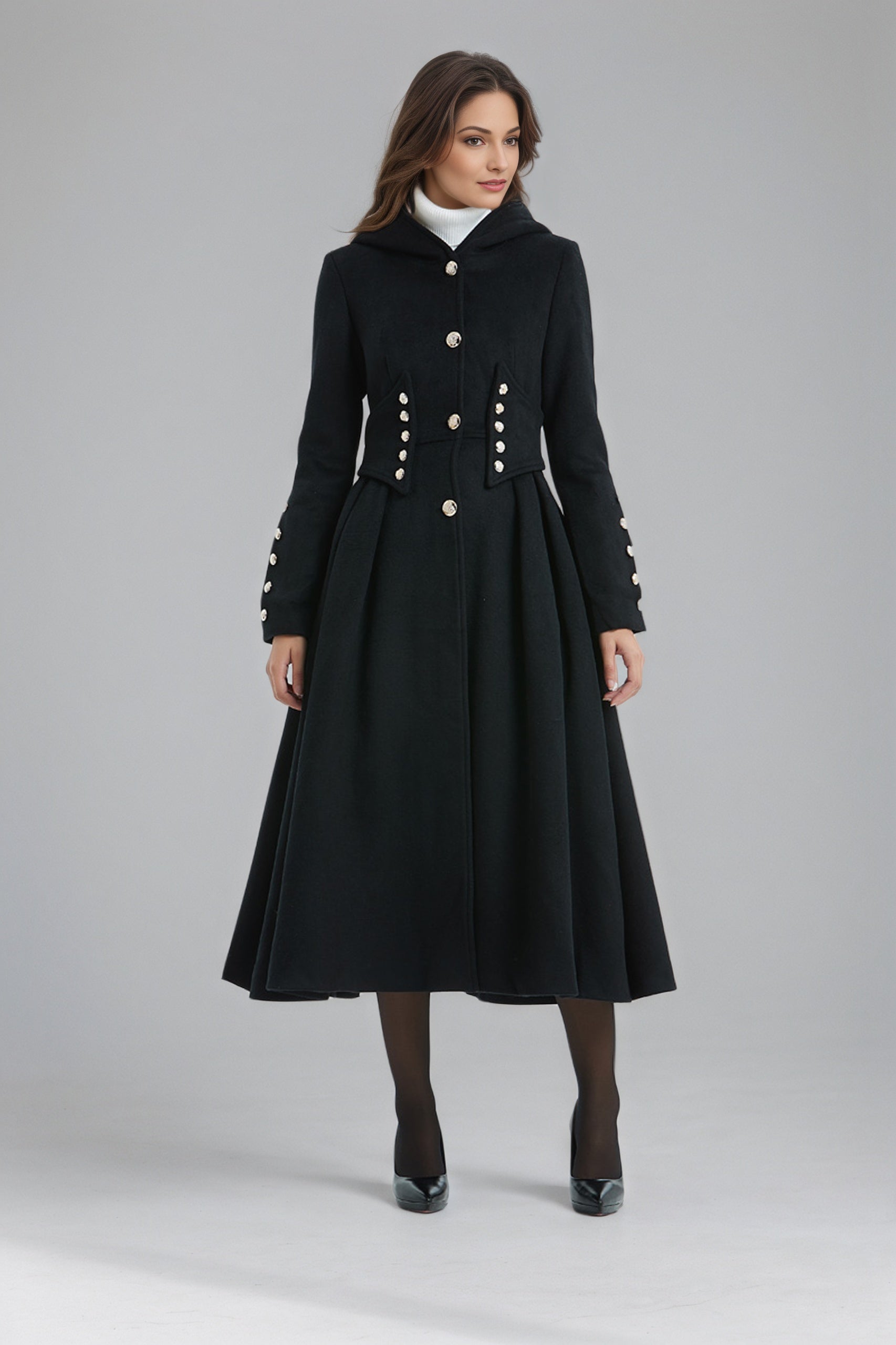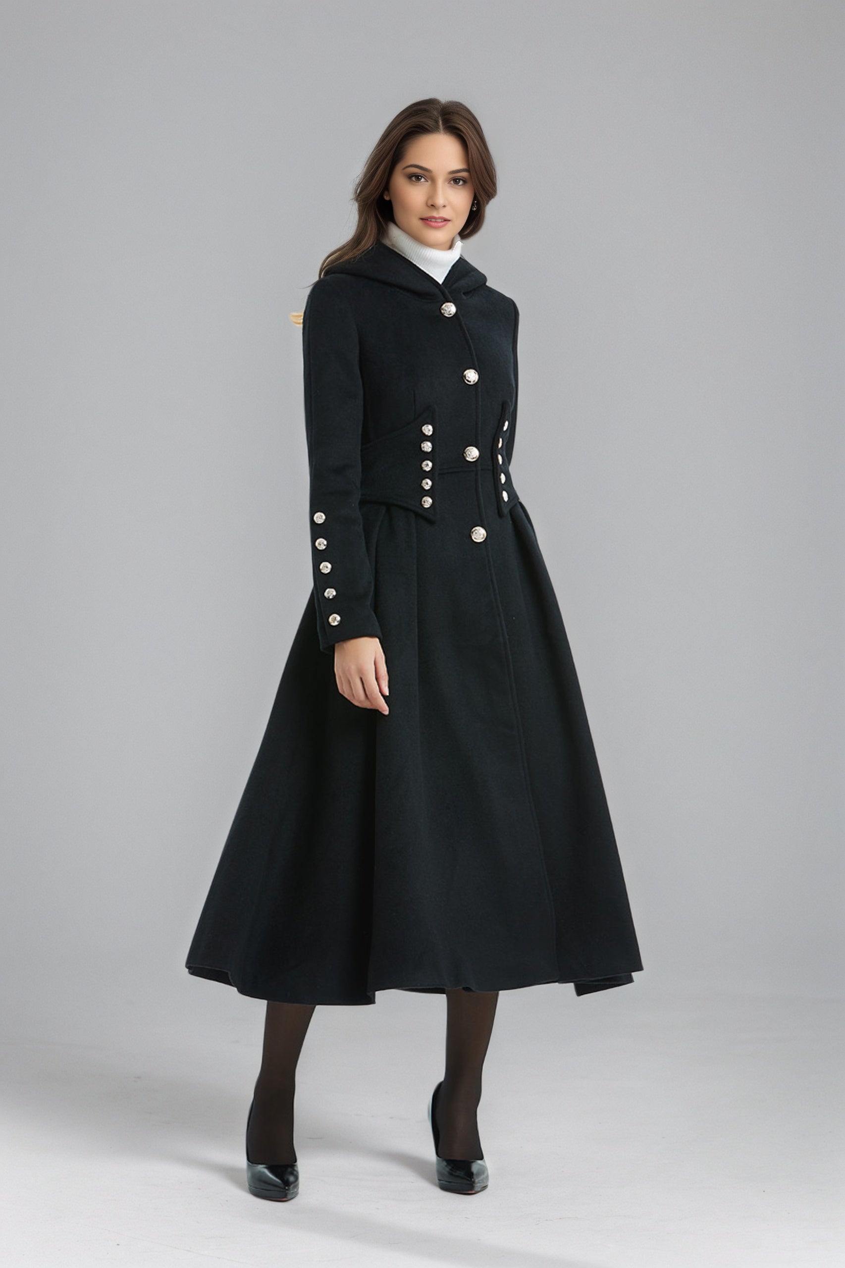 The black military coat is made of warm wool blend and polyester lining,and the stylish wool coat desigend with hooded and long sleeves make you keep warm in this cold winter.The winter outerwear has features a gorgeous nipped in waist with buttons details,fit and flare fit which is very flattering and will give womens a wonderful silhouette.the handmade coat finshed waist and sleeve with buttons,two pockets on side,and with pleated from waist to buttom,it will make you stand out in the crowd,it's your indispensable outerwear in this winter.