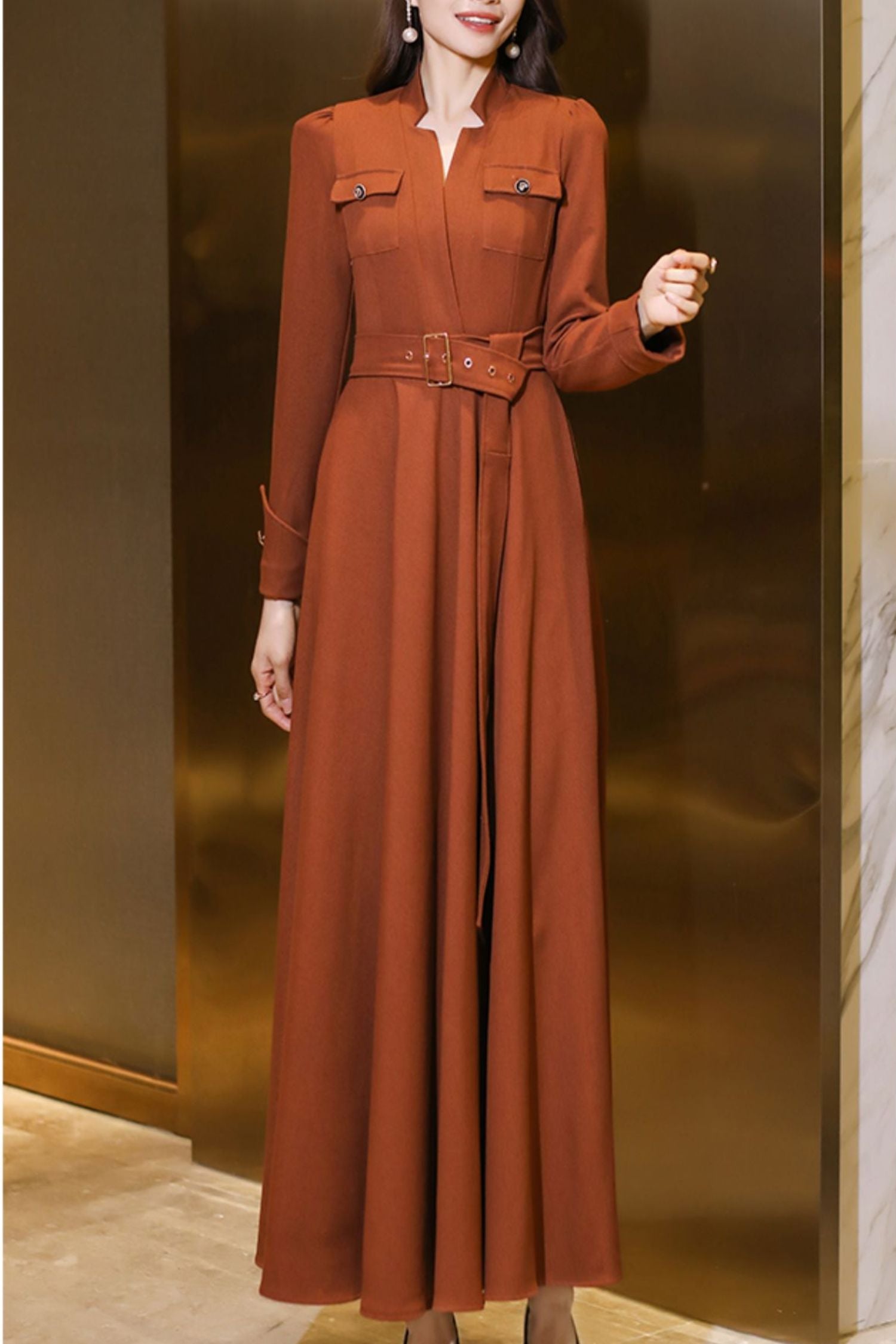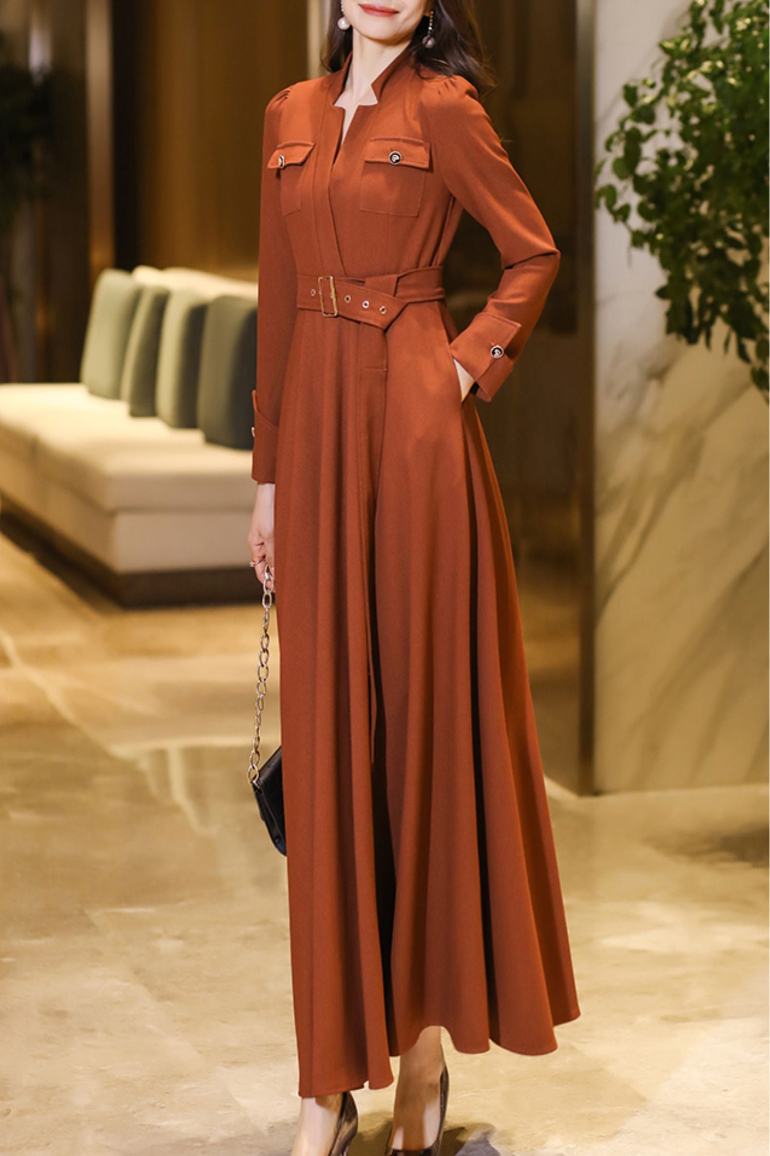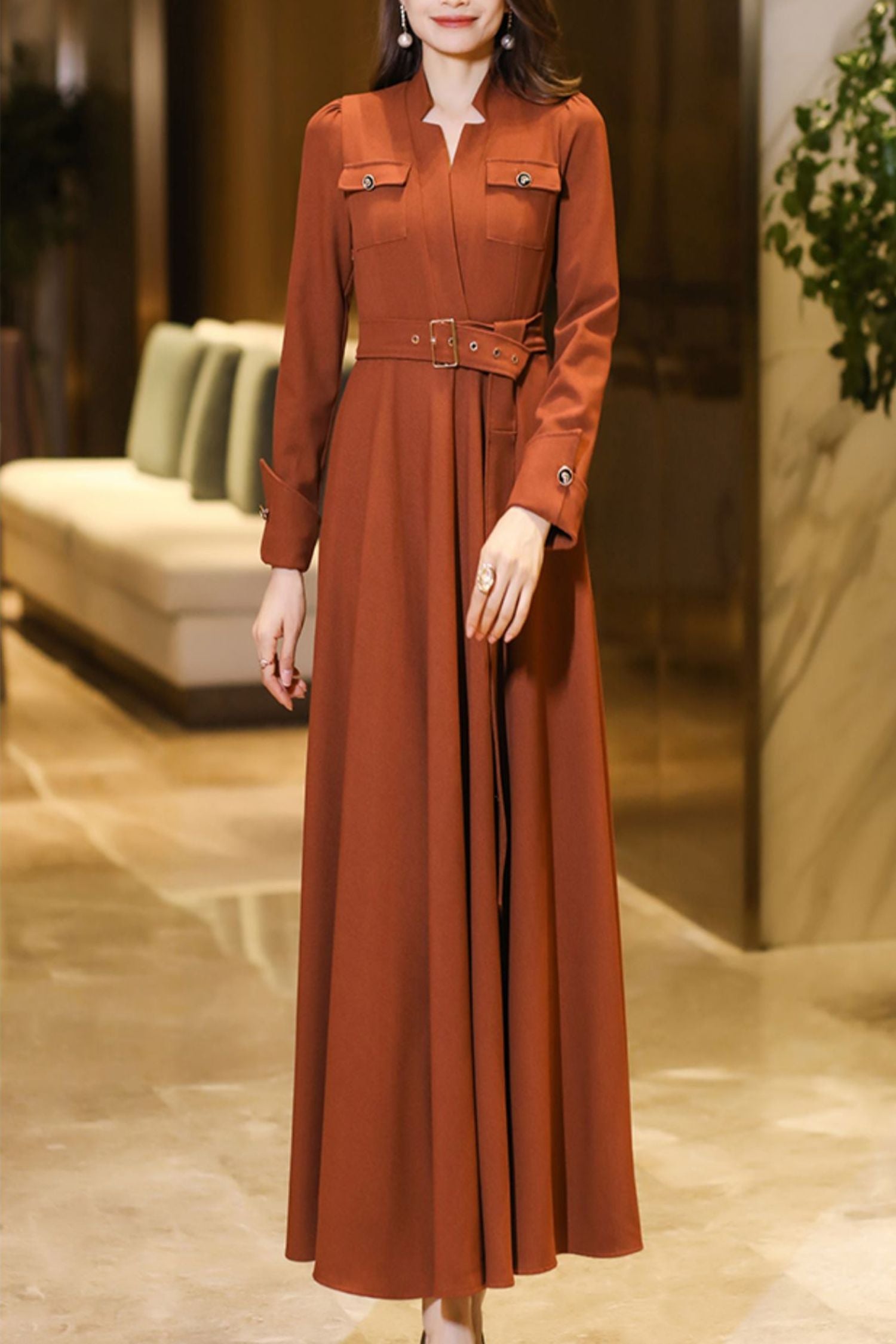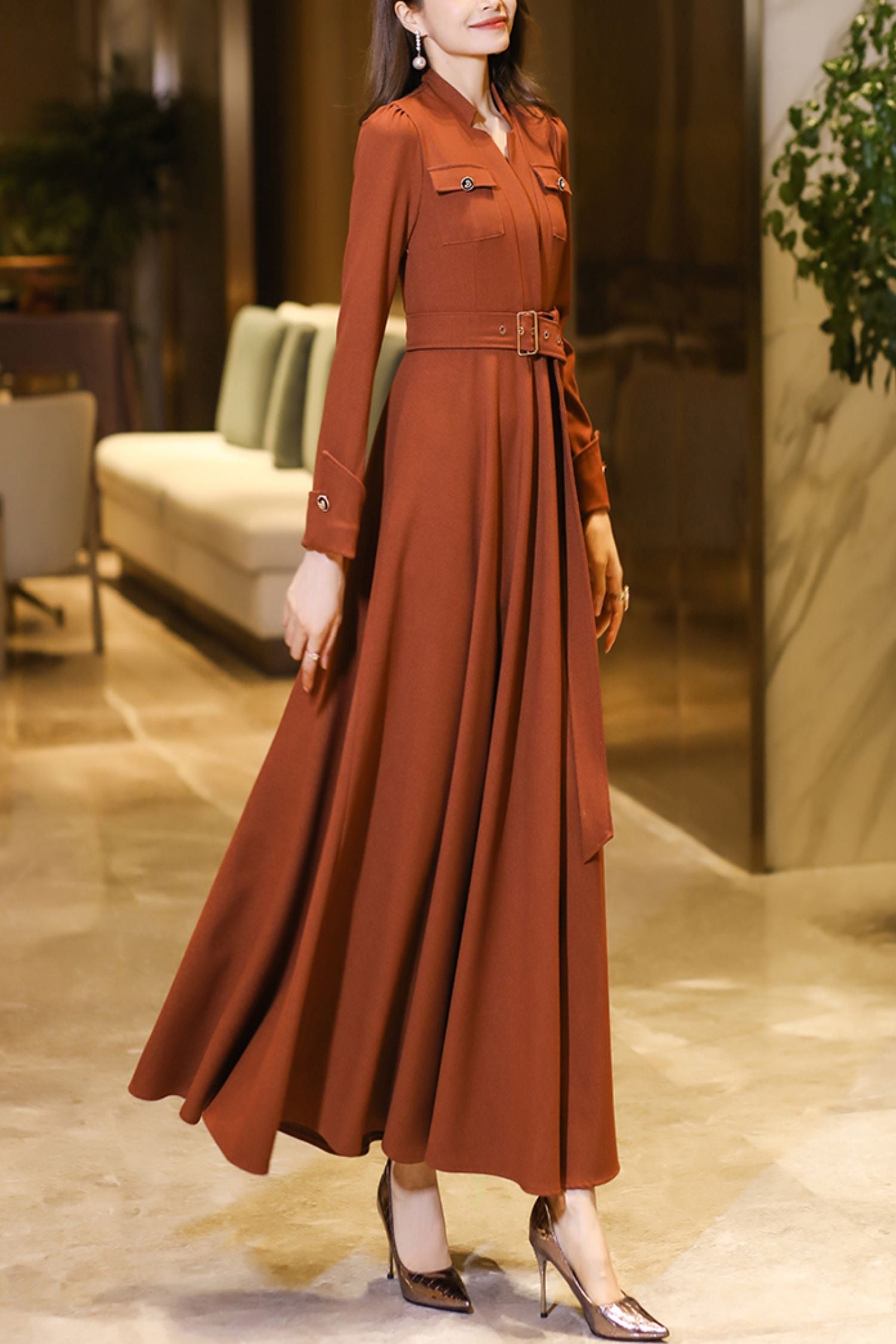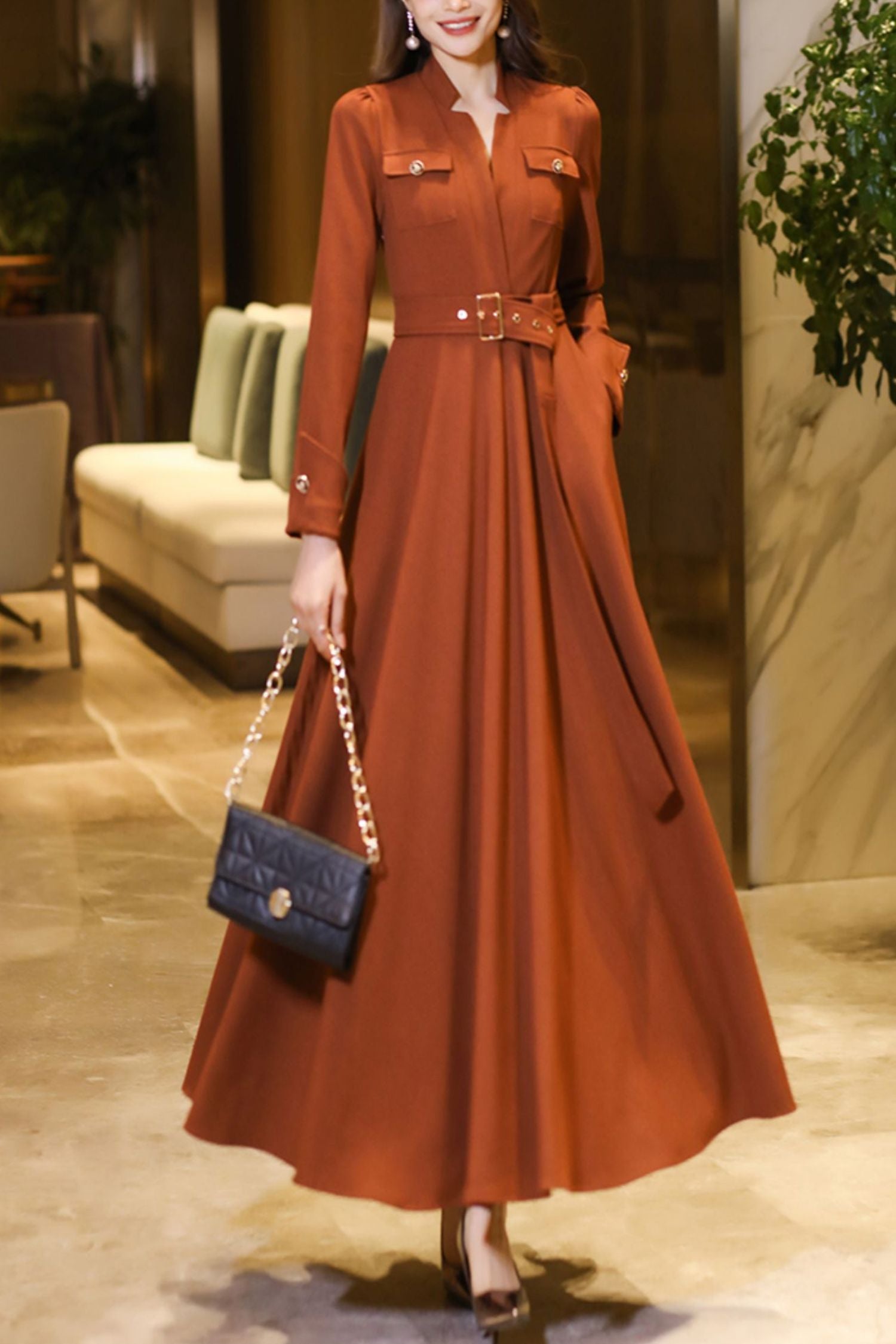 Indulge in luxurious style with our Orange women's v-neck long sleeved dress C4189. The vibrant orange color adds a bold touch to the classic v-neck and long sleeved design. Elevate your wardrobe with this elegant dress, perfect for any occasion.