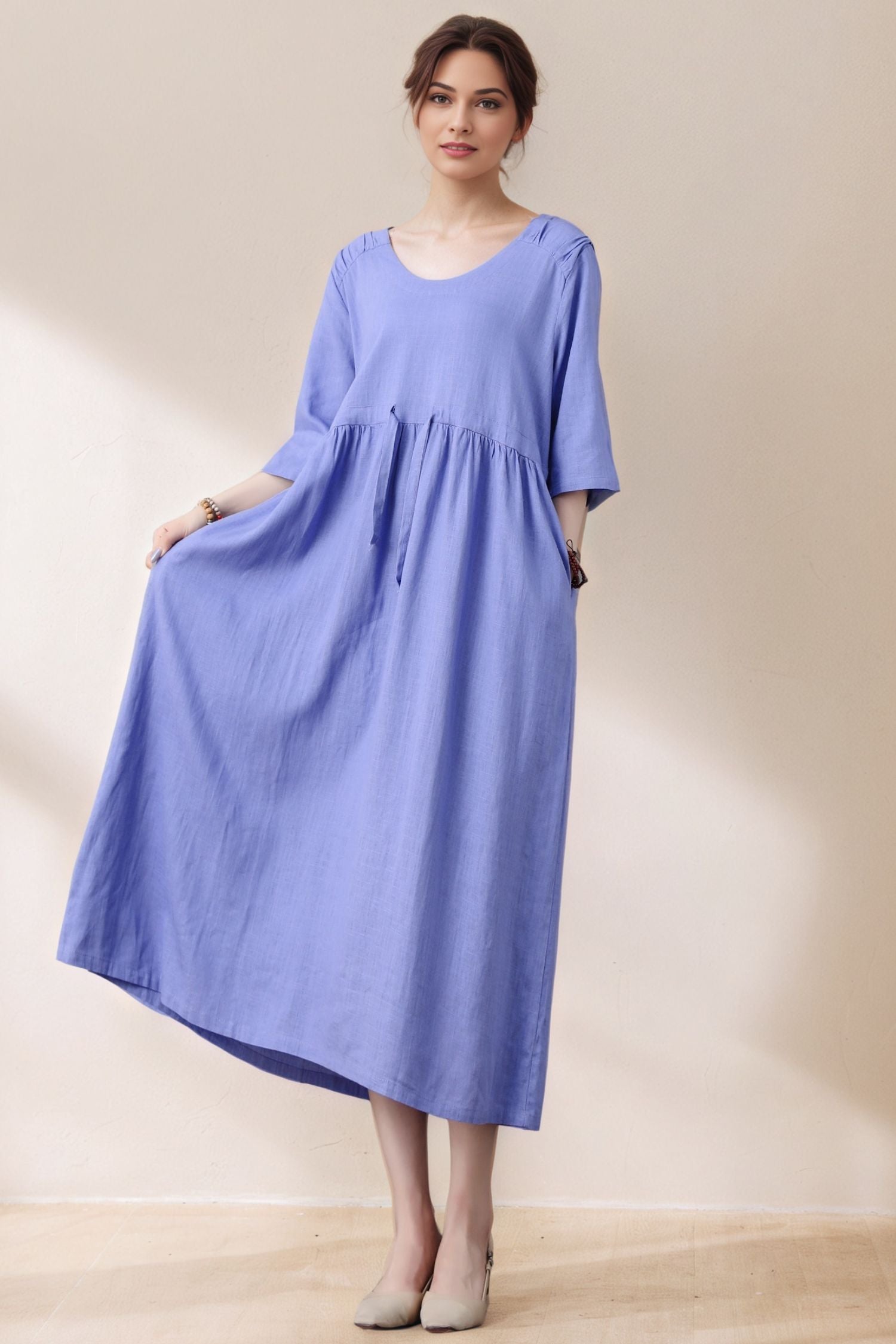 Purple 3/4 Sleeve Pleated Linen Dress With Drawstring C5389
