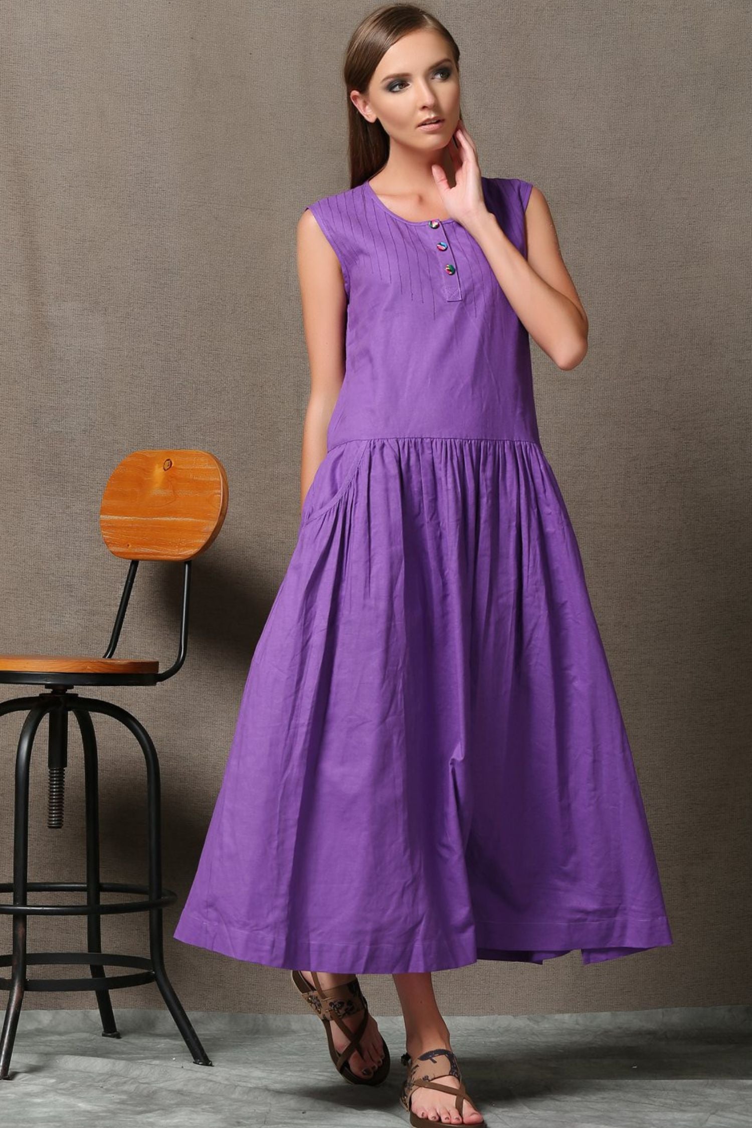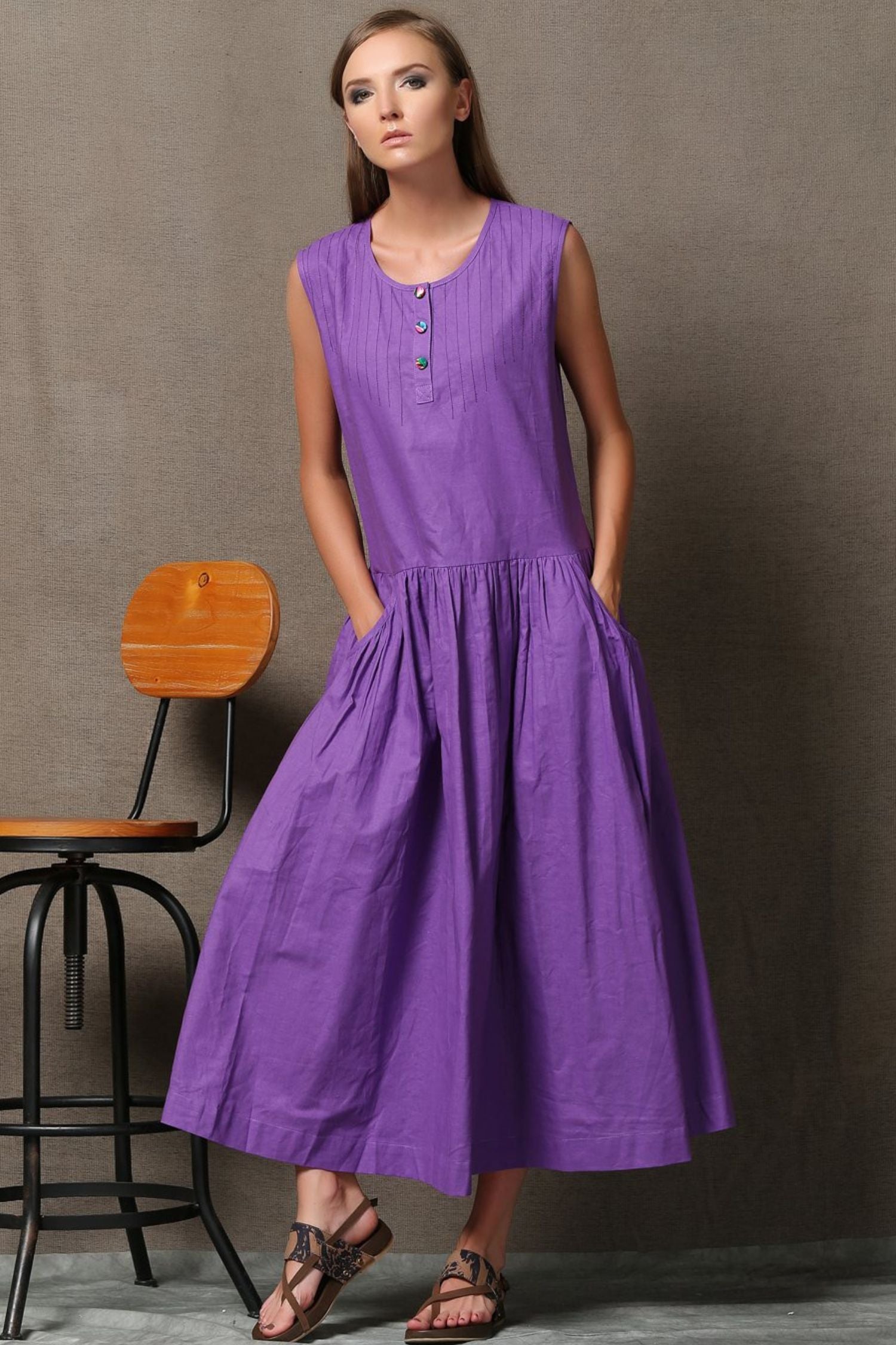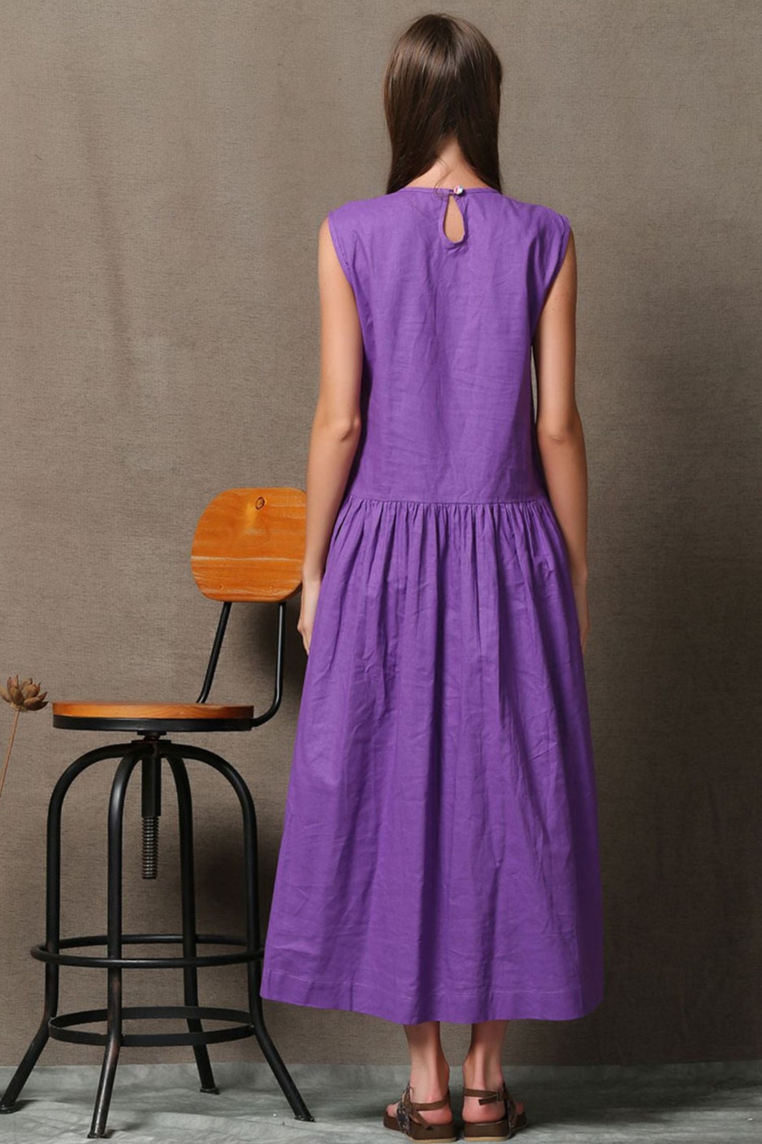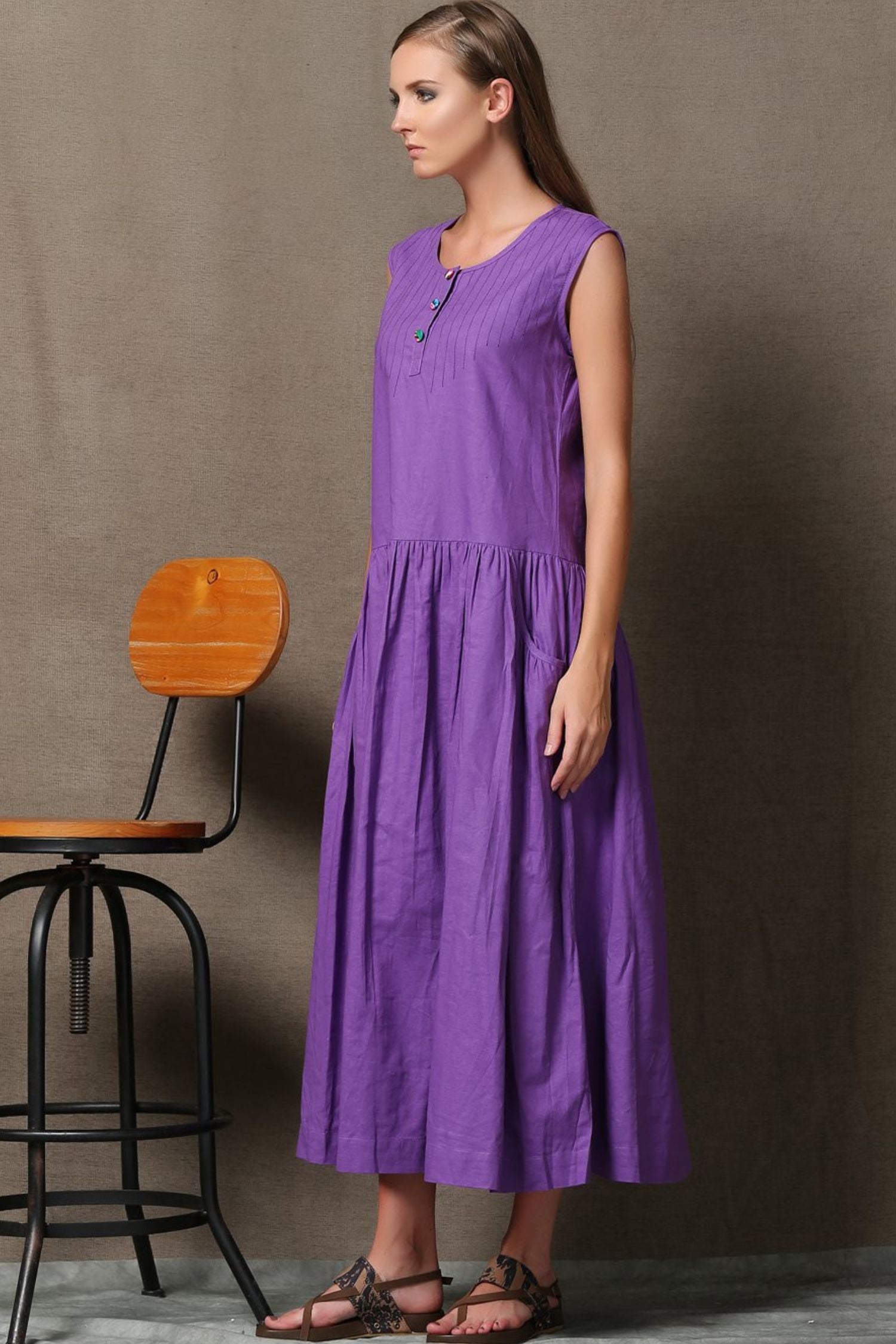 Purple Linen Dress - Loose-Fitting Fit and Flare Sleeveless Womens Dress with Pockets C541