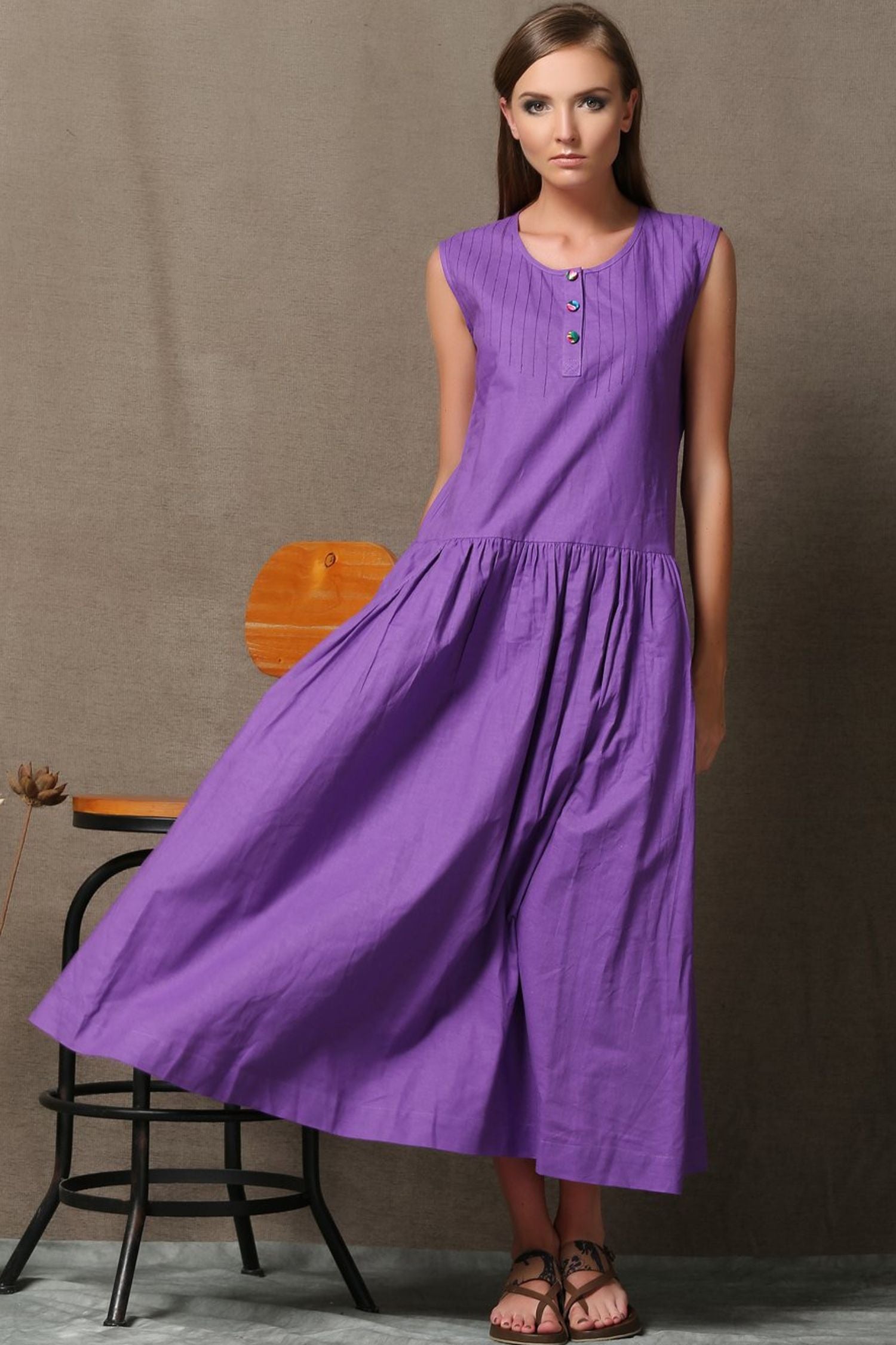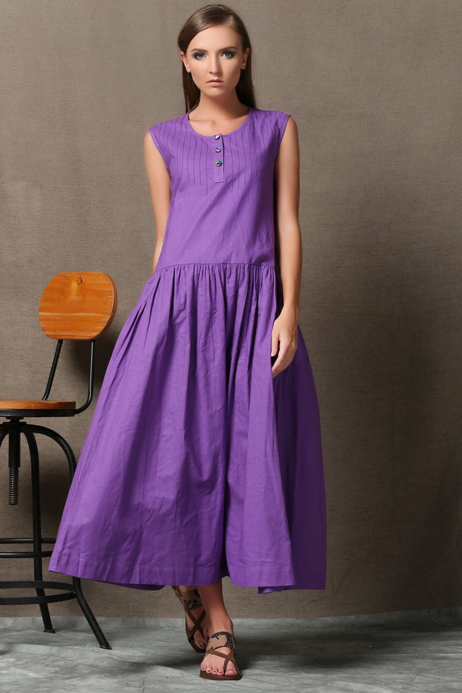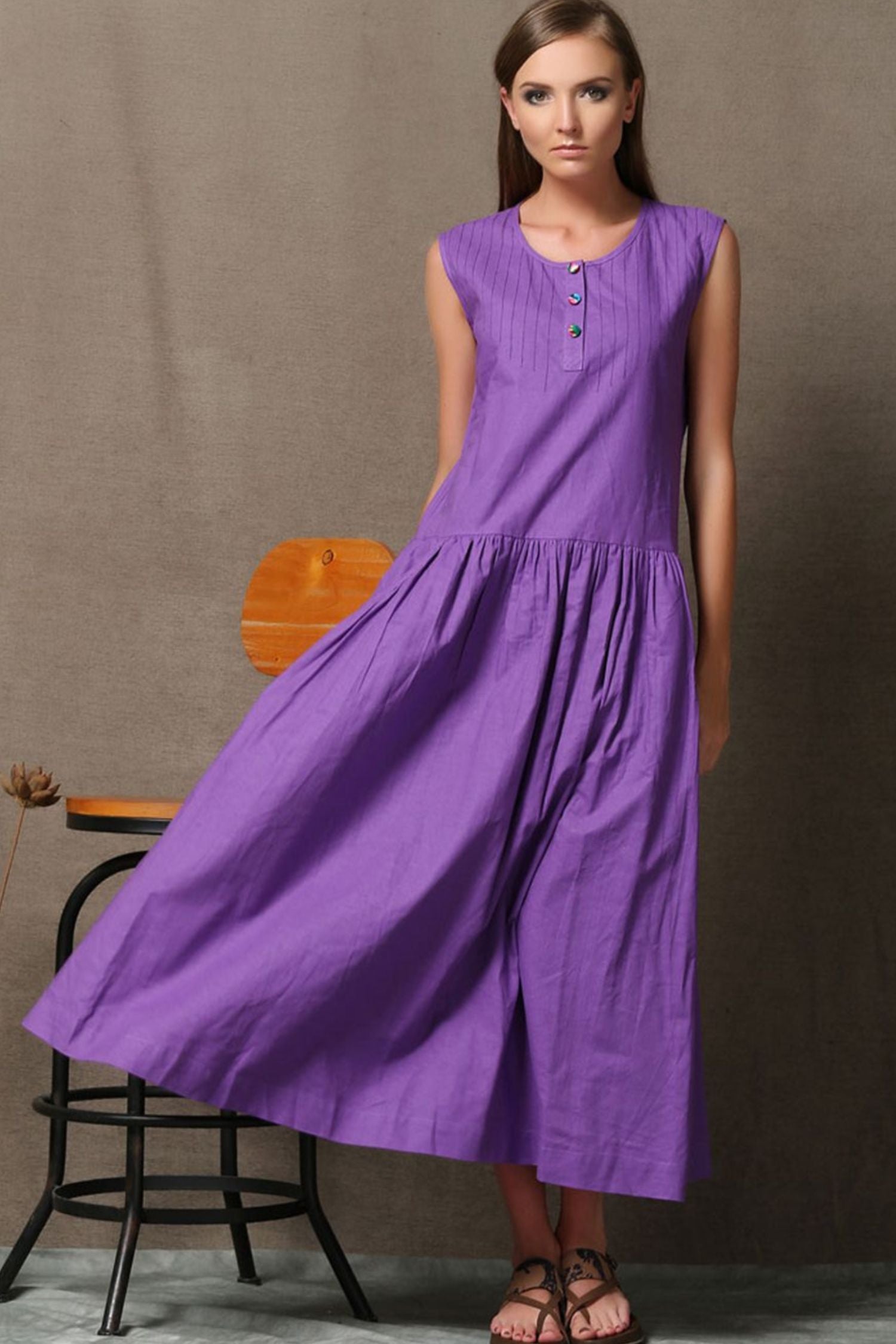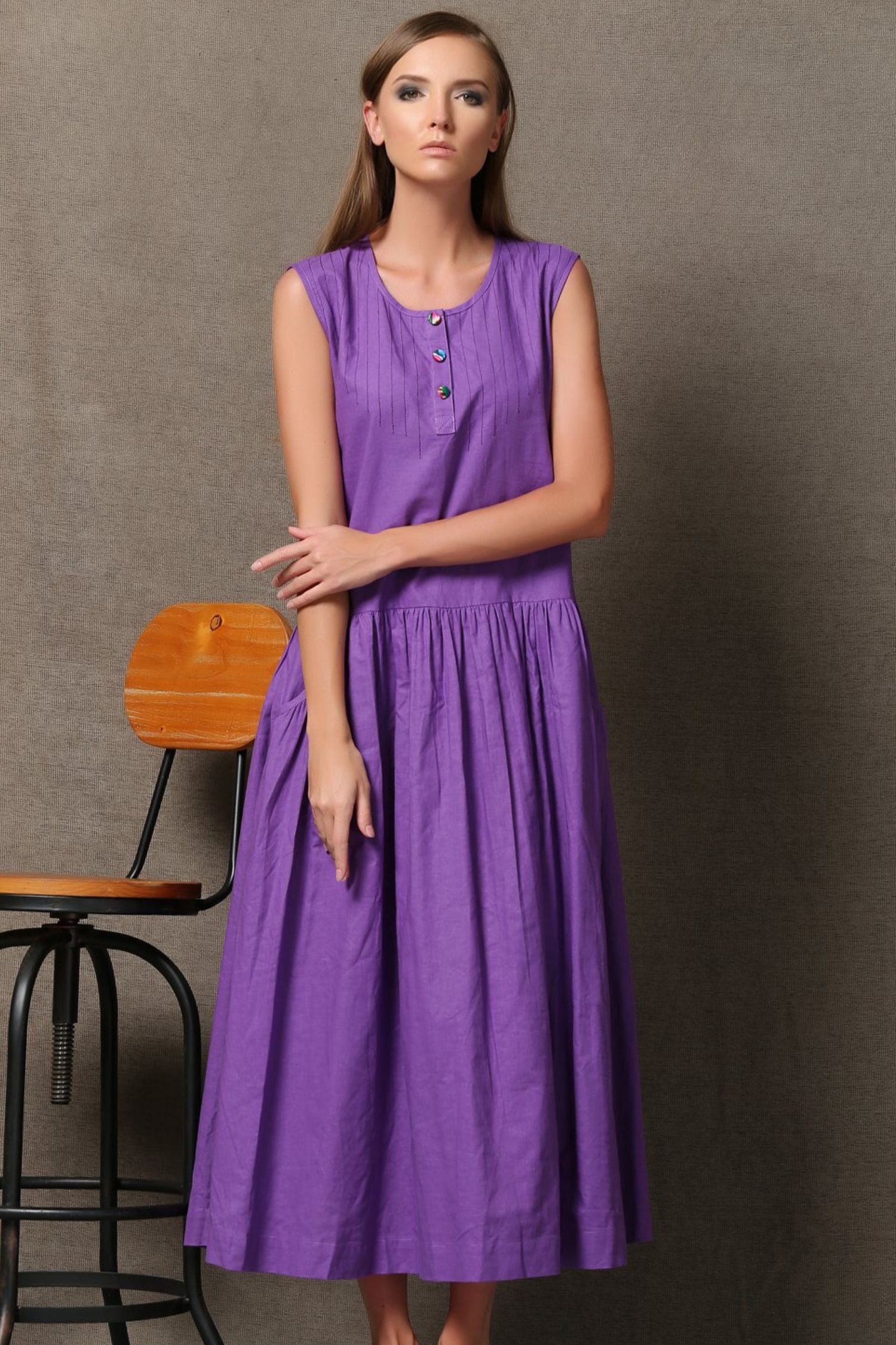 Purple Linen Dress - Loose-Fitting Fit and Flare Sleeveless Womens Dress with Pockets C541