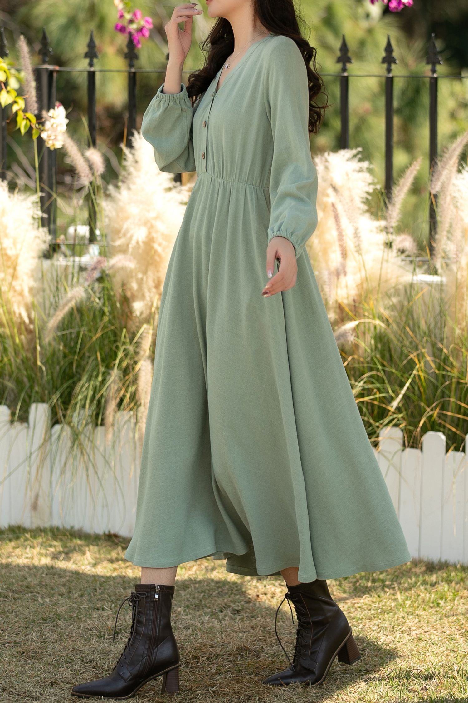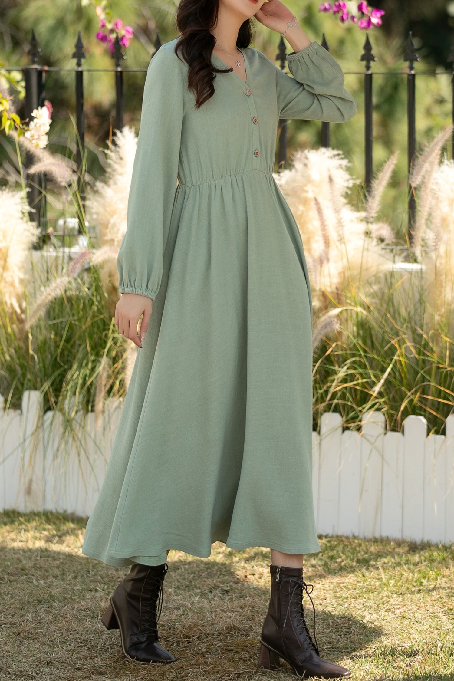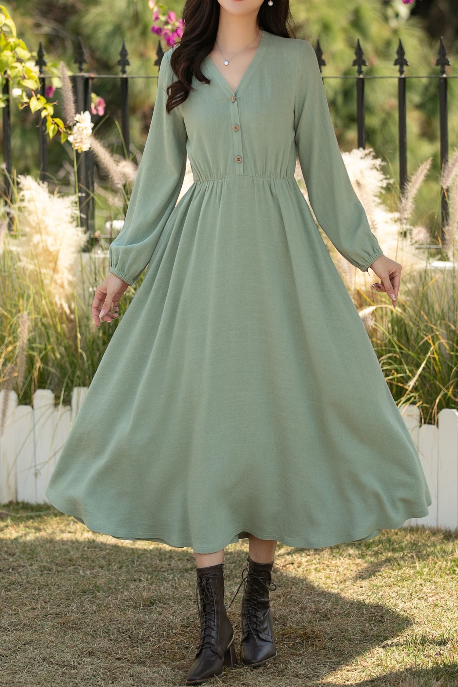 A sage green linen cotton midi dress for women — vintage inspired, breathable, and timeless. Designed for spring and autumn wear, this long sleeve A-line dress blends comfort with understated elegance.