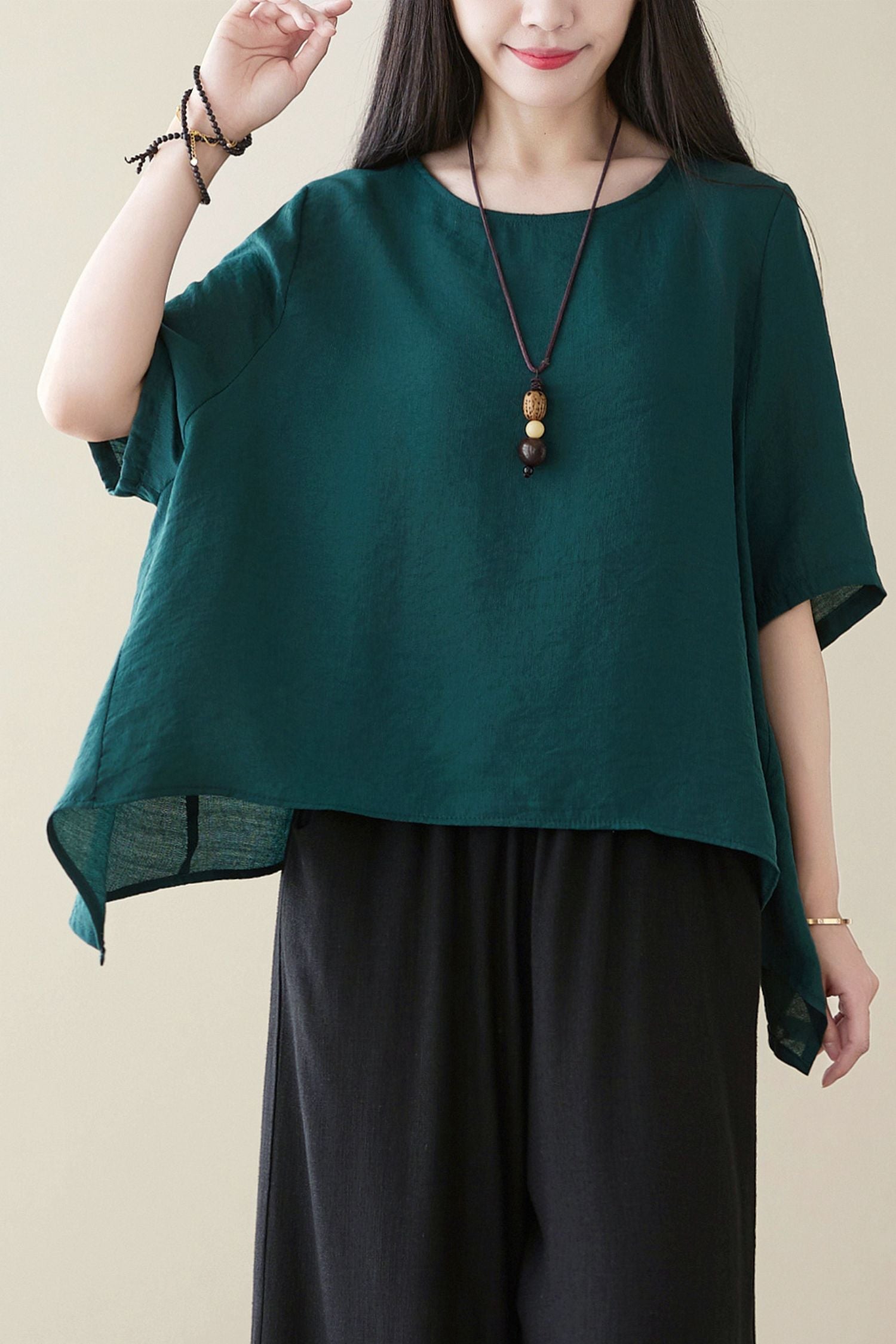 Elevate your summer wardrobe with our Short Sleeve Vintage Blouse, crafted with soft linen for a timeless, breathable fit. This classic asymmetrical blouse is designed to flatter any figure, making it a versatile addition to your wardrobe. Embrace effortless elegance with our Loose Tops for women.