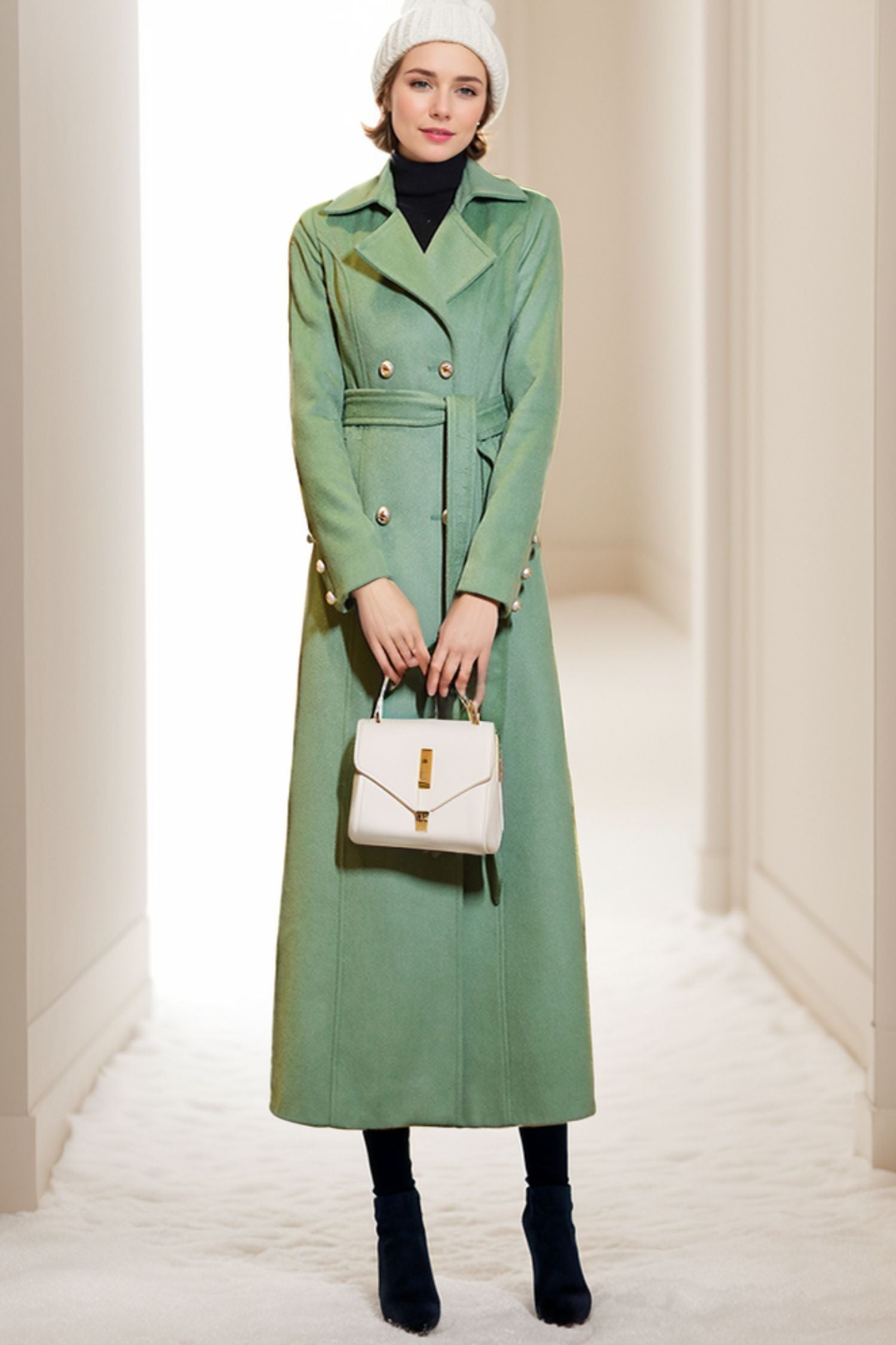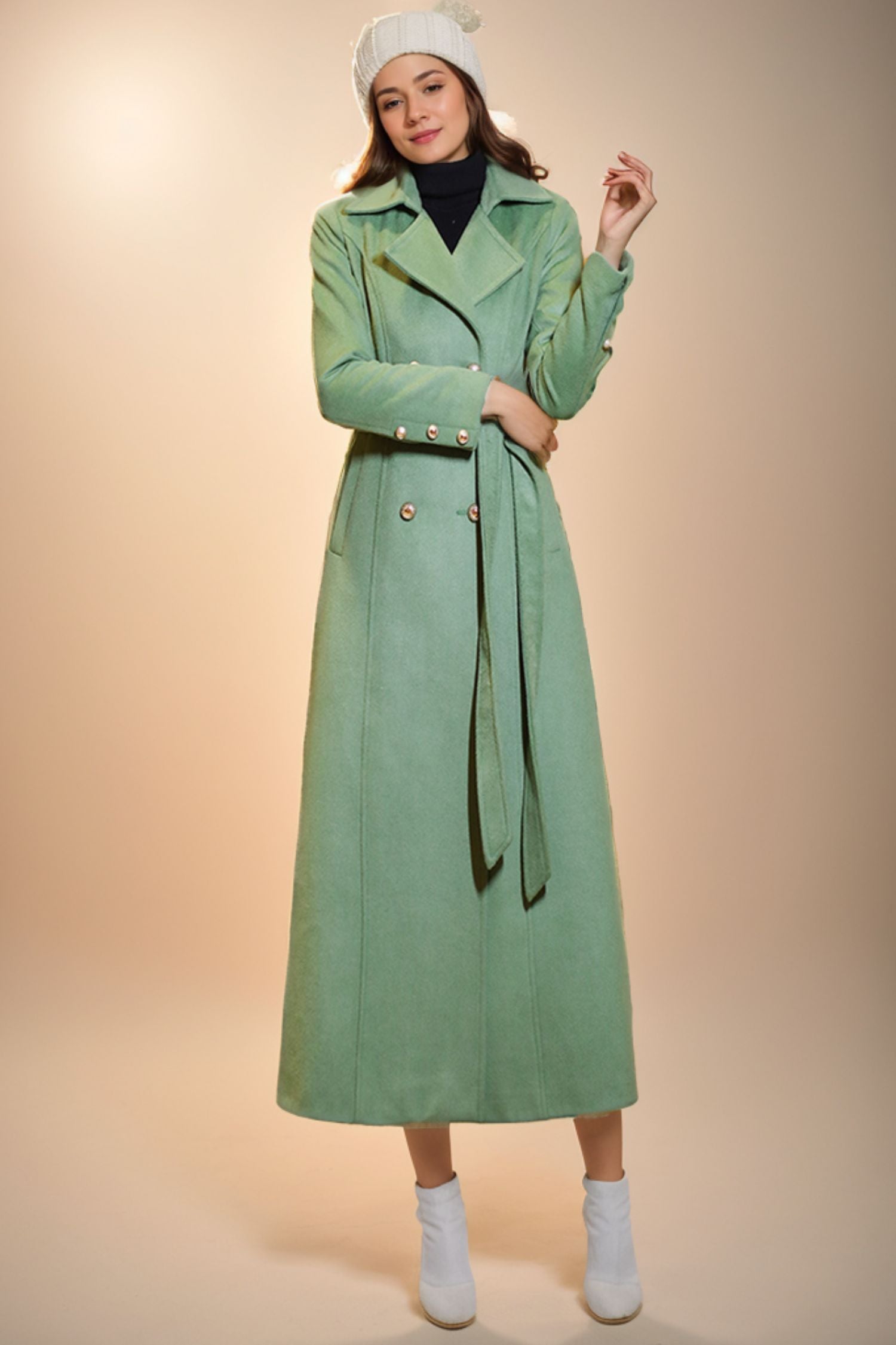 Indulge in luxury with our Trench Green Wool Coat for Women. Made from high-quality wool, this sophisticated coat is both elegant and exclusive. Its trench style exudes a timeless and classic look, perfect for any occasion. Add a touch of sophistication to your wardrobe today with C4074.