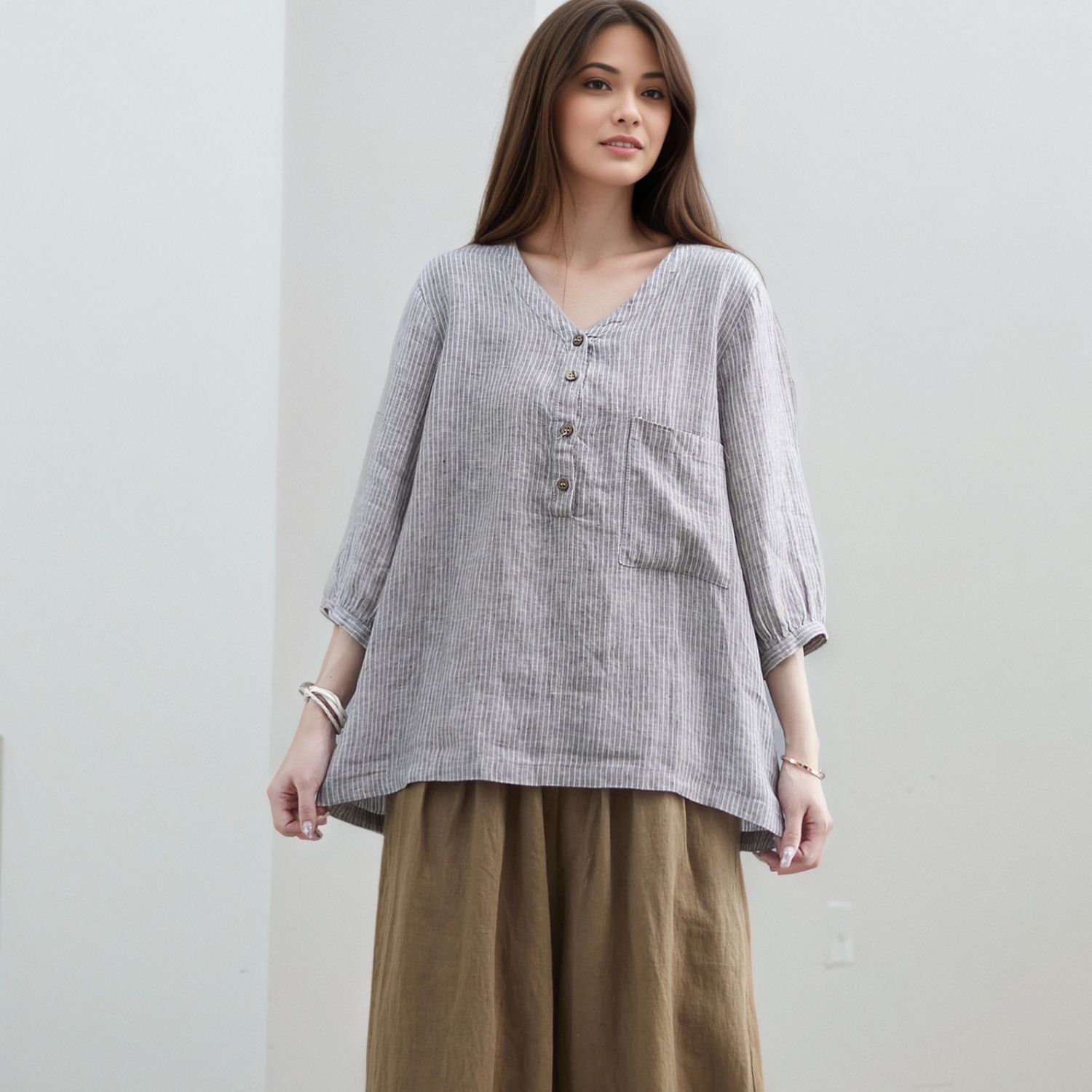 V-Neck Linen Blouse, Loose Fit Top C5318