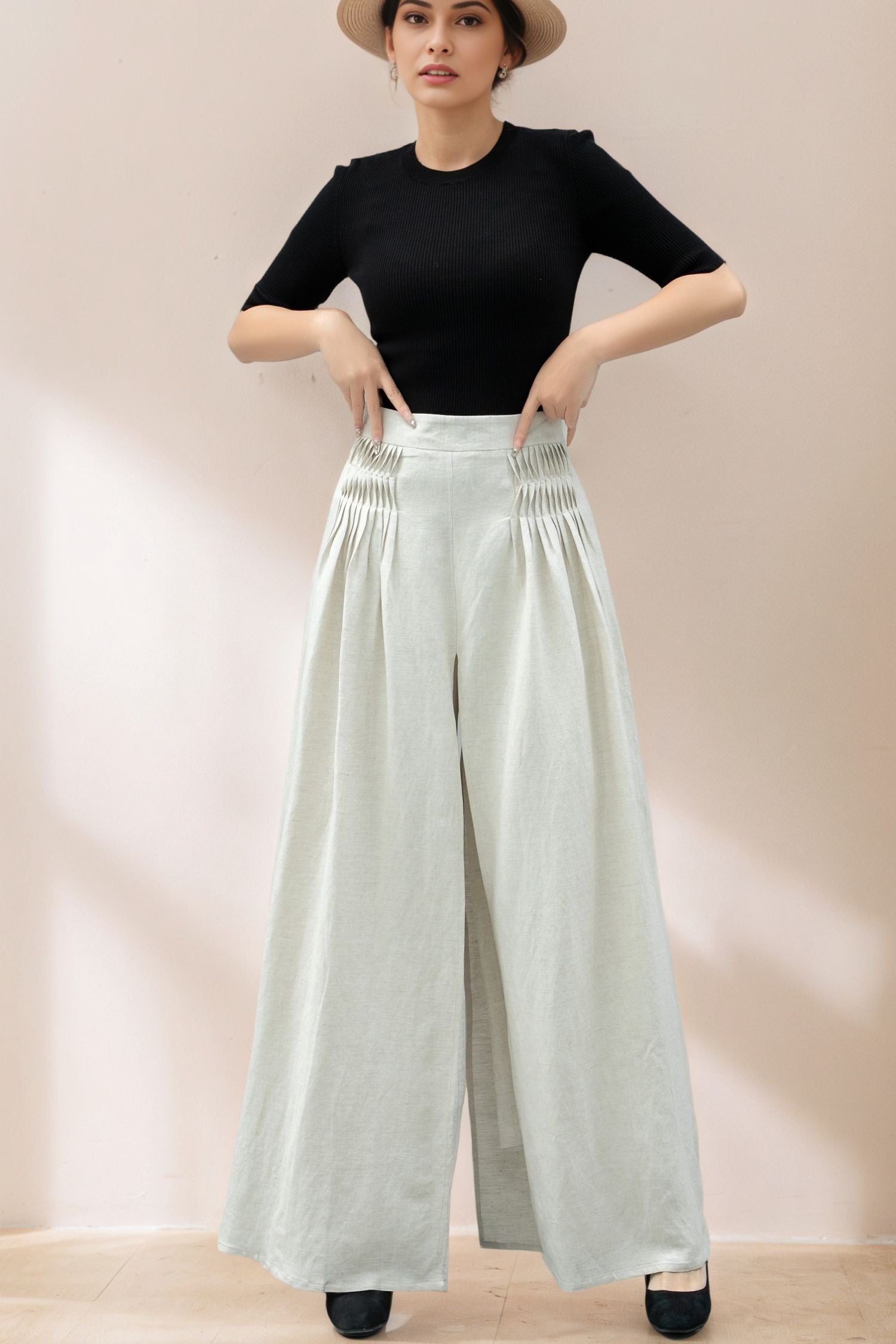 Elevate your wardrobe with these elegant white linen palazzo pants, designed for both comfort and style. Featuring a high-waisted fit and wide-leg silhouette, these pants offer a graceful, flowy look that’s perfect for any occasion. The pleated details around the waist add a touch of sophistication.
