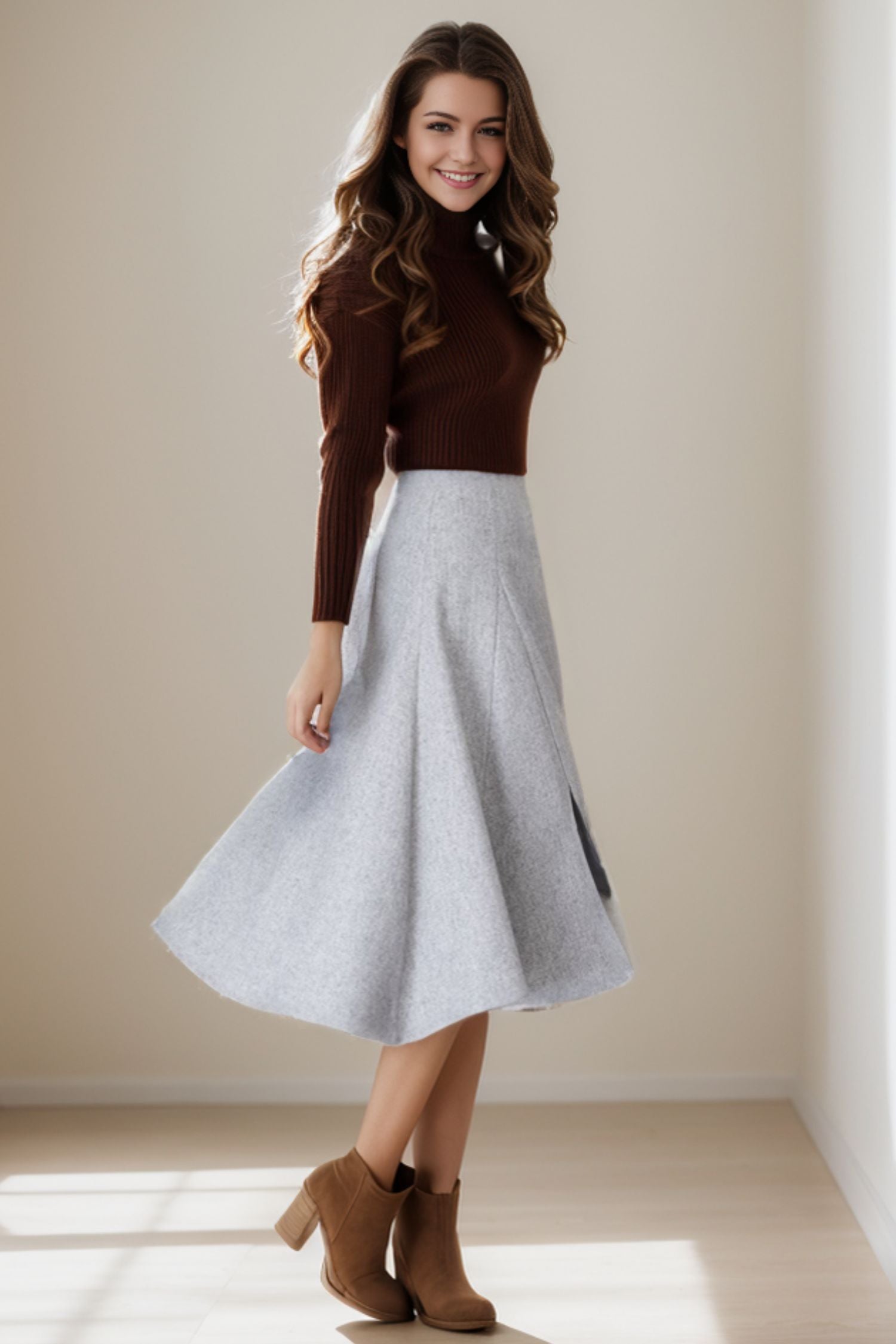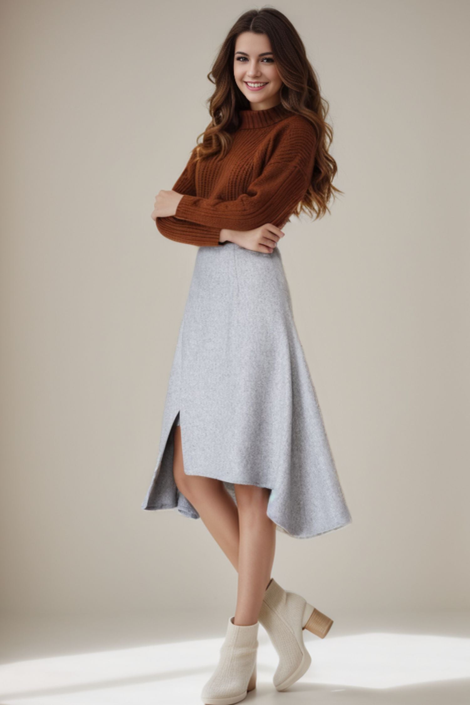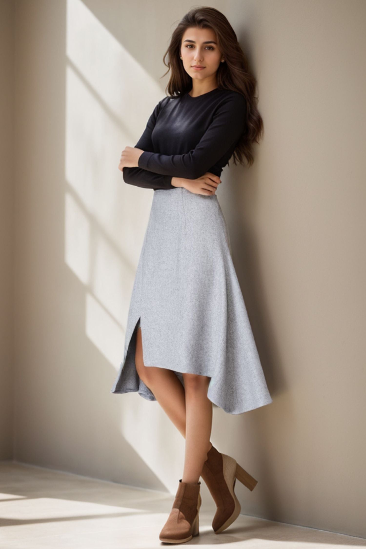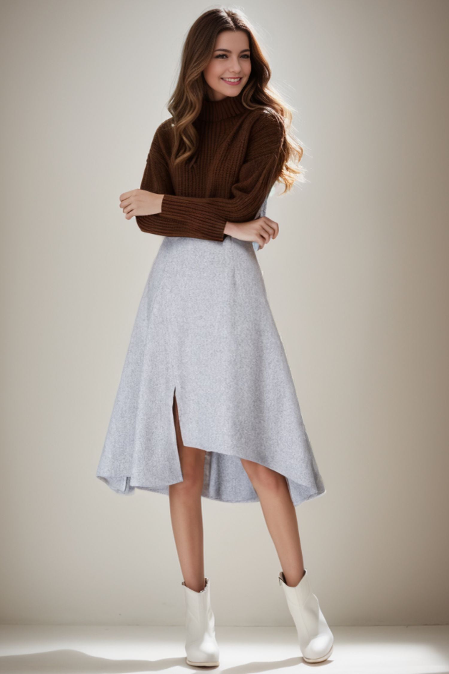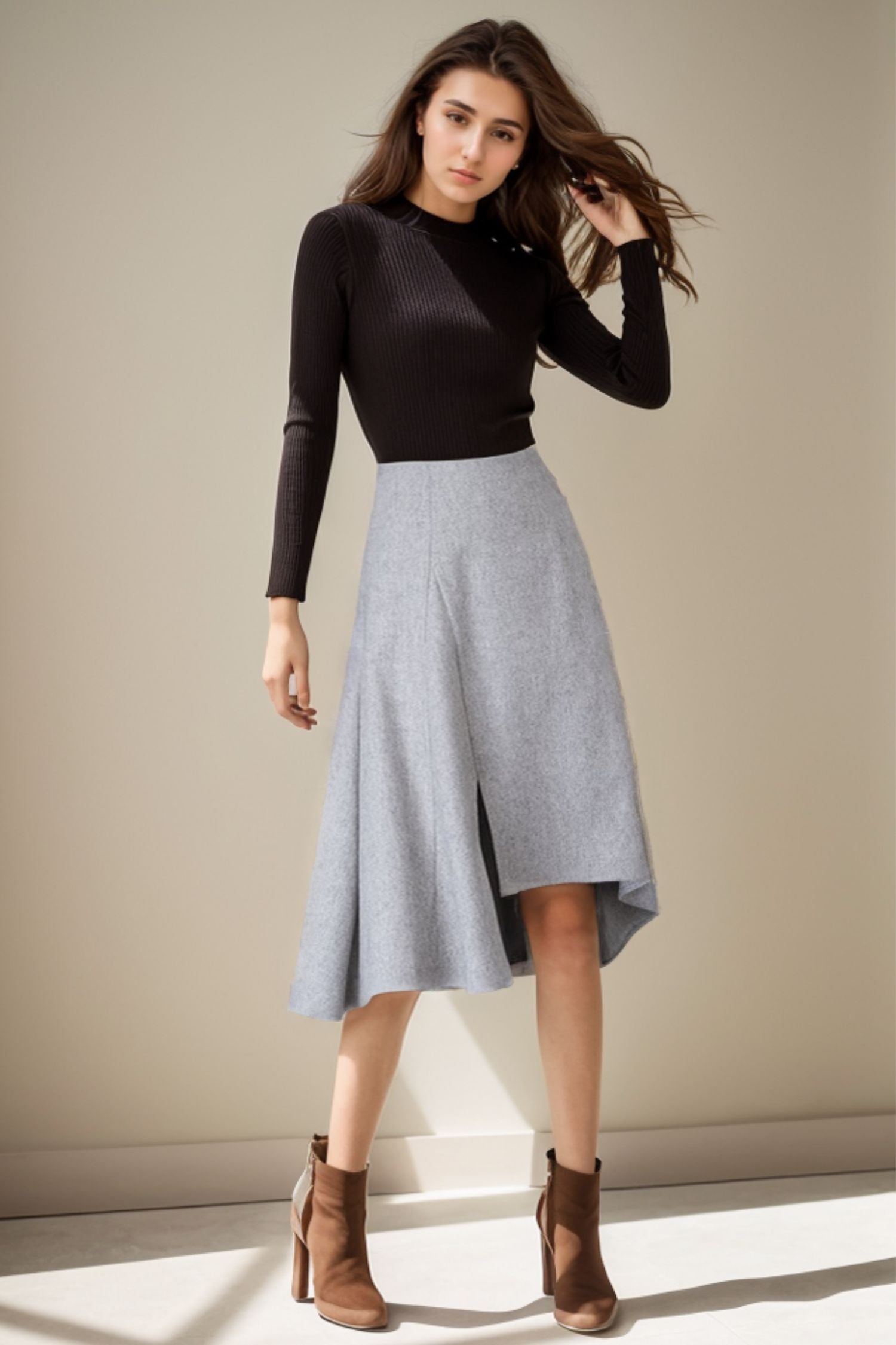 Elevate your winter wardrobe with our Winter gray wool asymmetrical skirt! Made with high-quality wool, it's warm and stylish. Its unique asymmetrical design adds a touch of edge to any outfit. Stay cozy and fashion-forward this season.