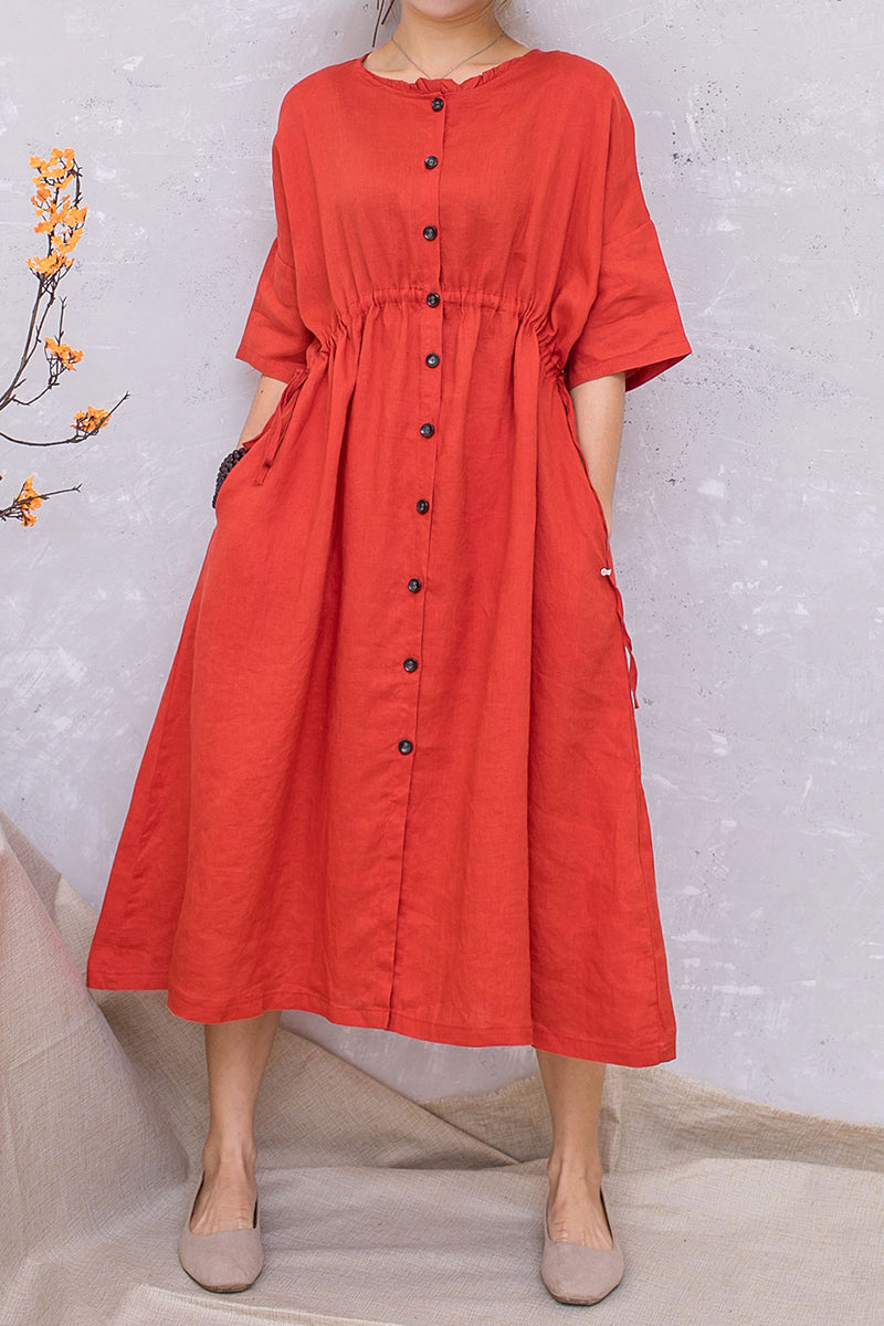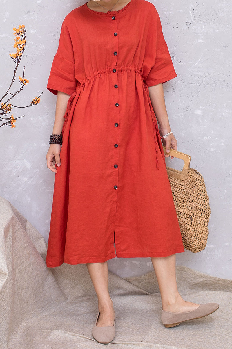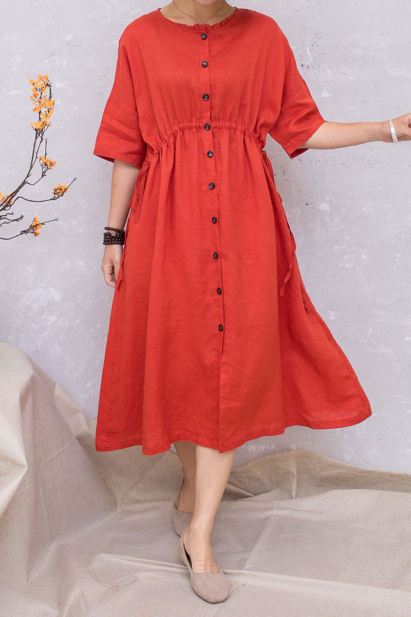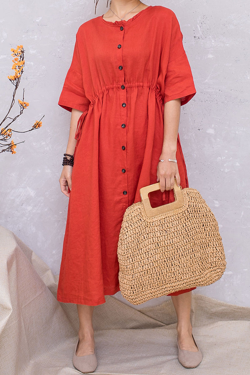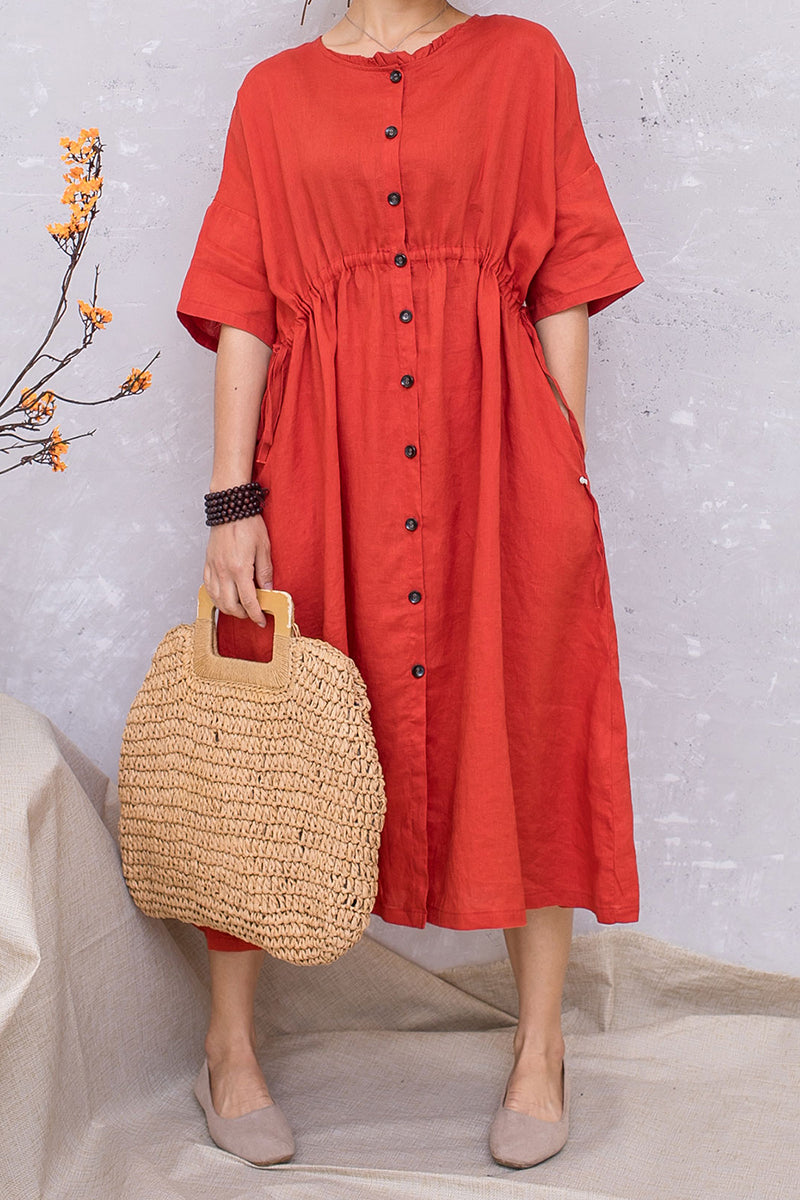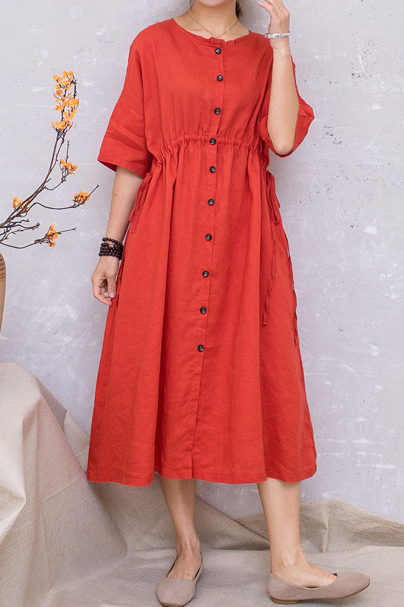 Women Linen Half Sleeve Loose Elastic Waist Dress C2813 #CK2201407