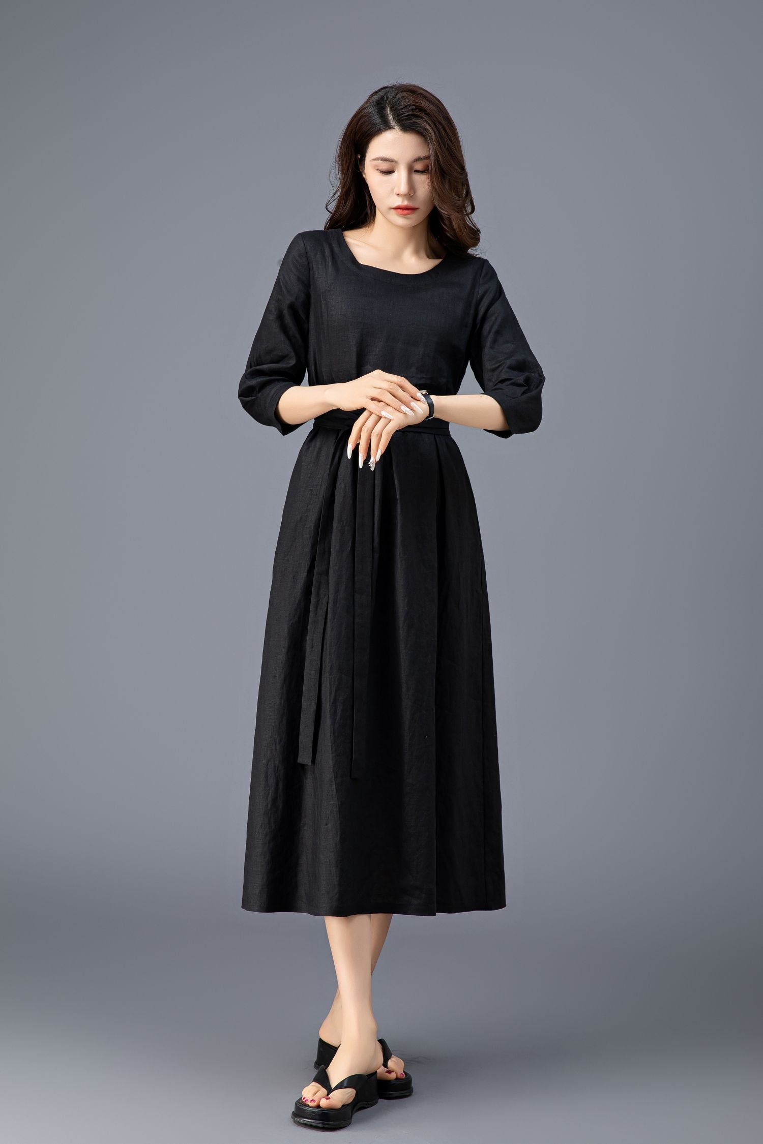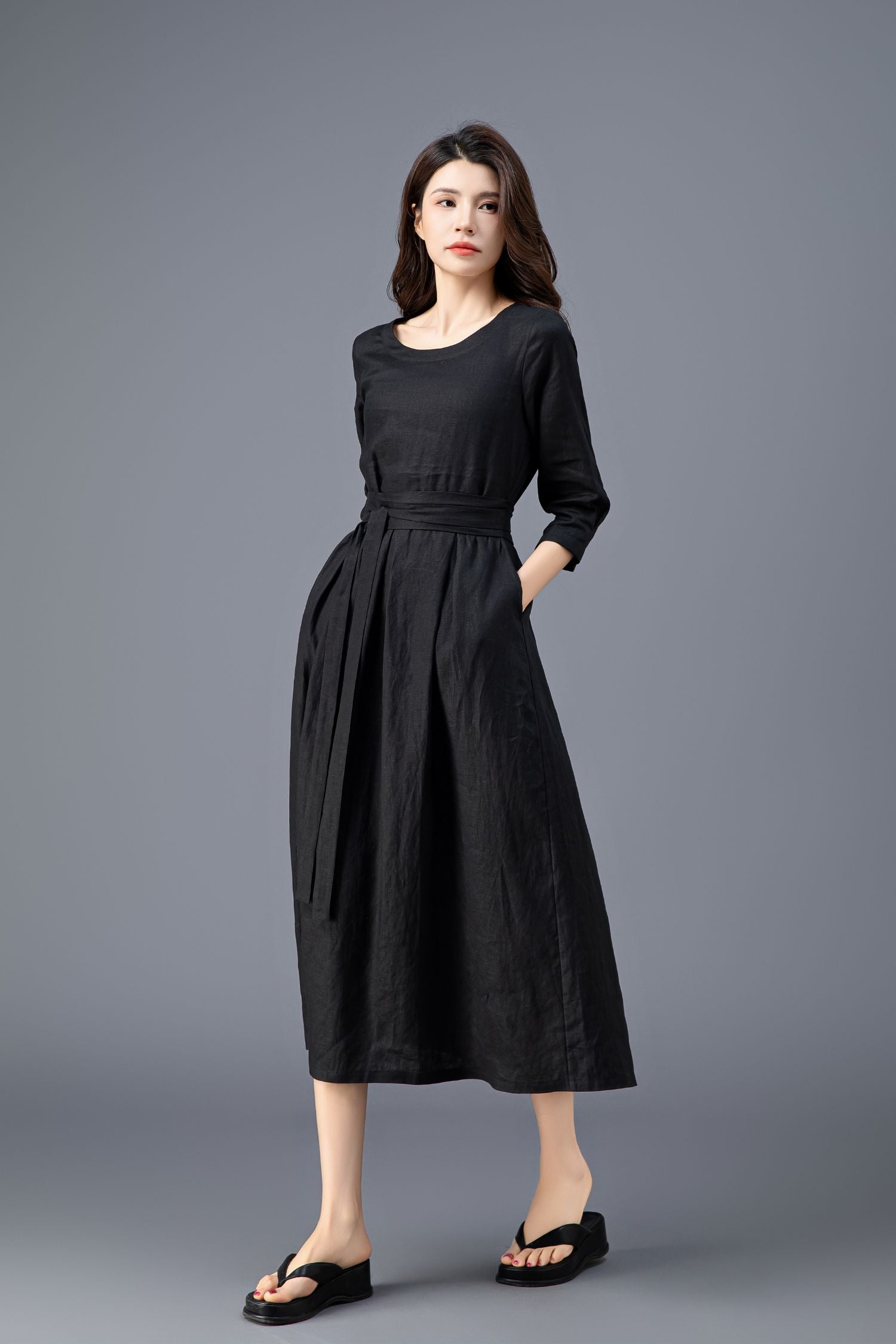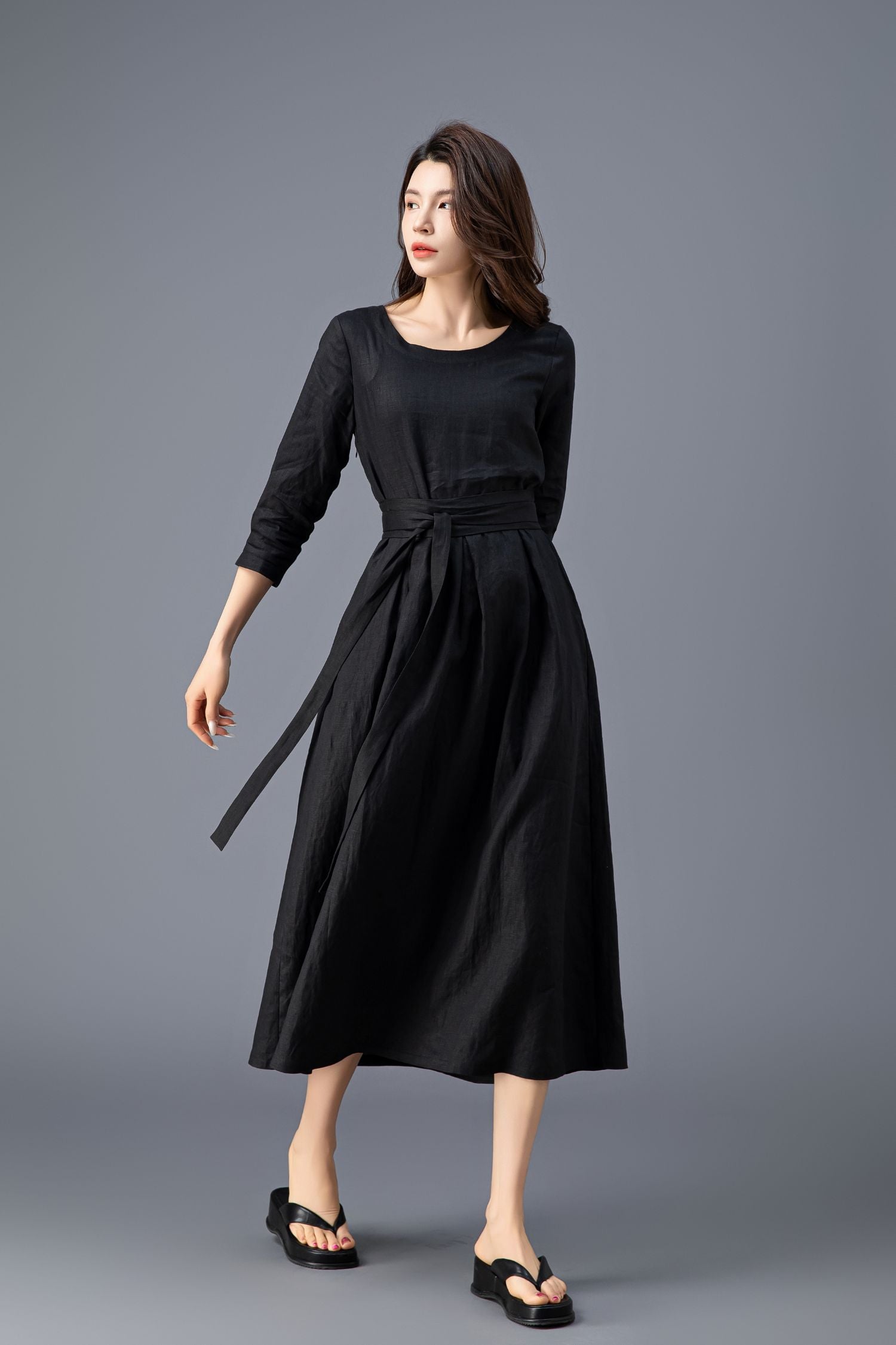 Women's Casual Belted Black Linen Dress C3911