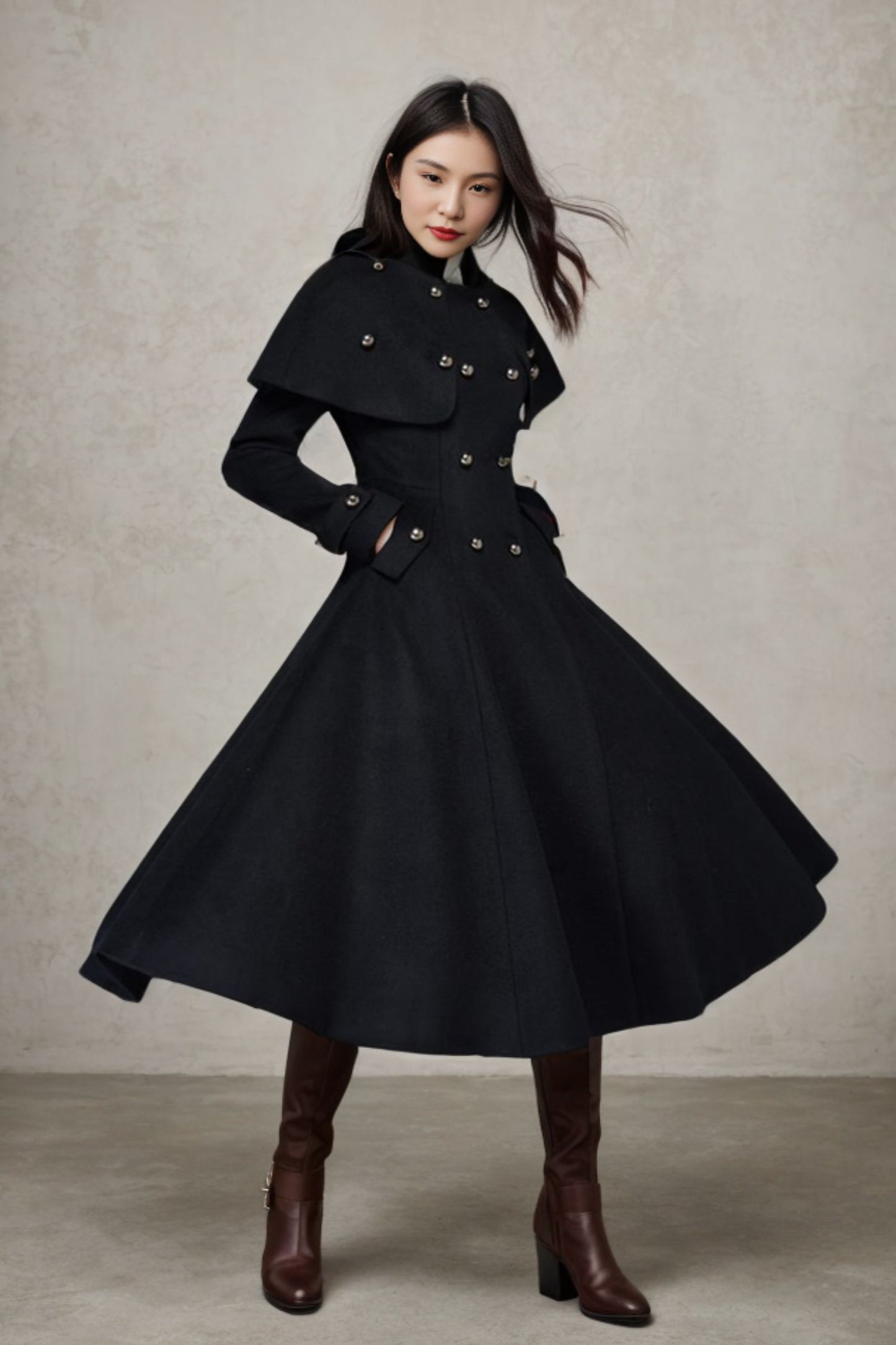 The winter coat has been re-imagined and we have taken some lovely design features of the season such as this Capelet wool coat, Fabric is very pretty & warm for outside occasions
