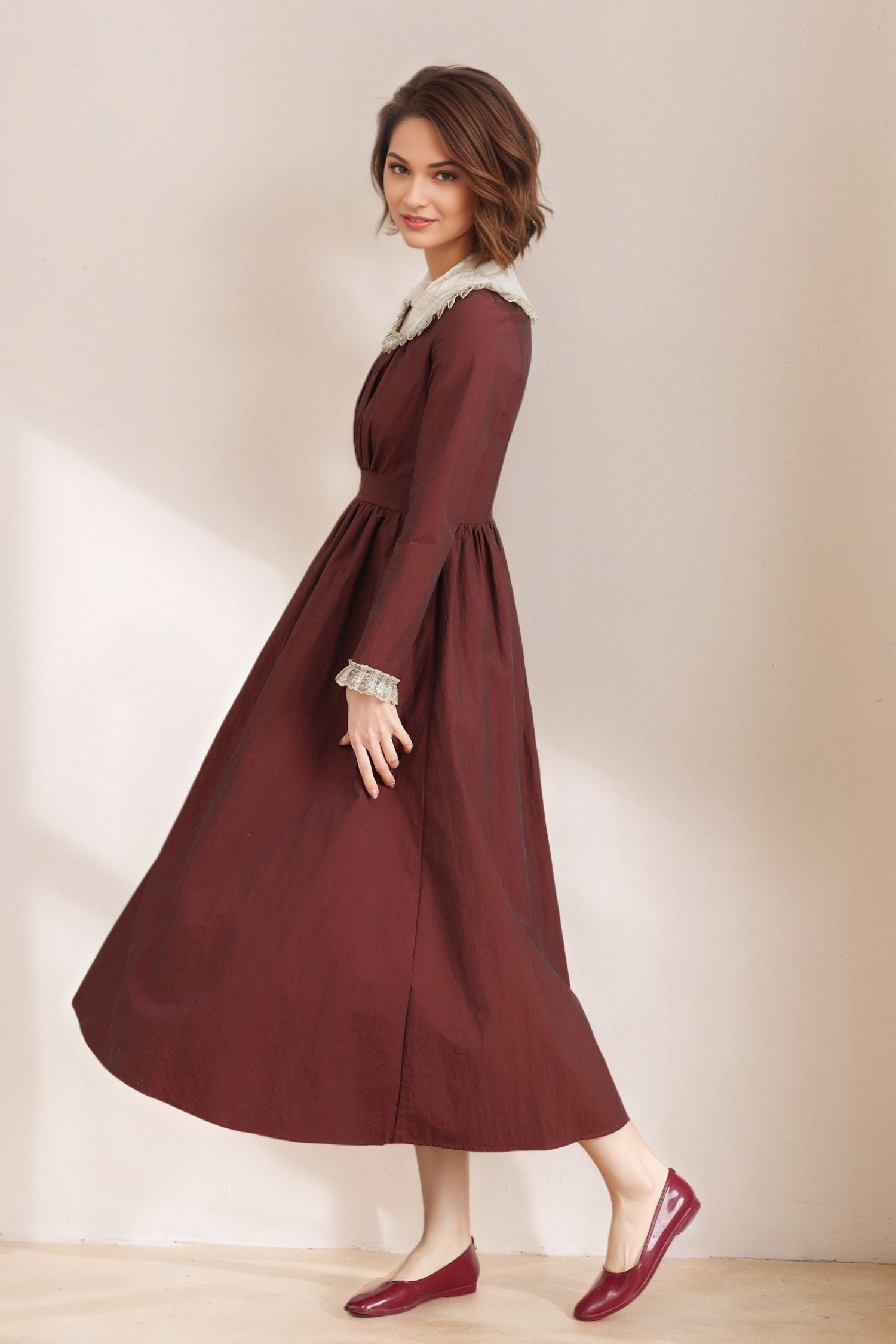 Women's vintage maxi dress, in a Burgundy color, made of soft linen fabric. This courtly princess dress, complete with lace, is exquisite and perfect for a party or date.