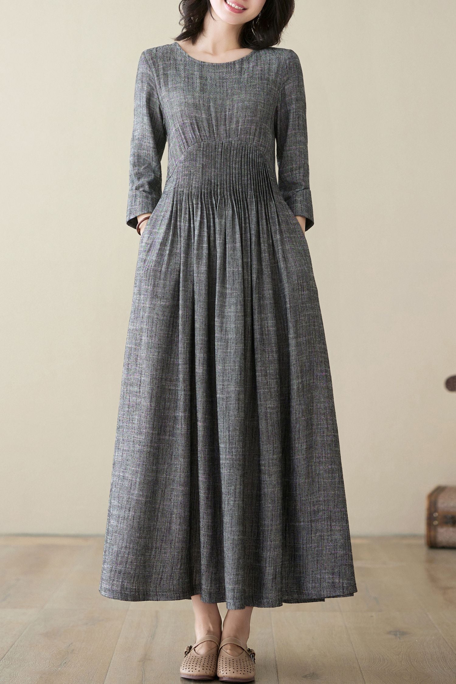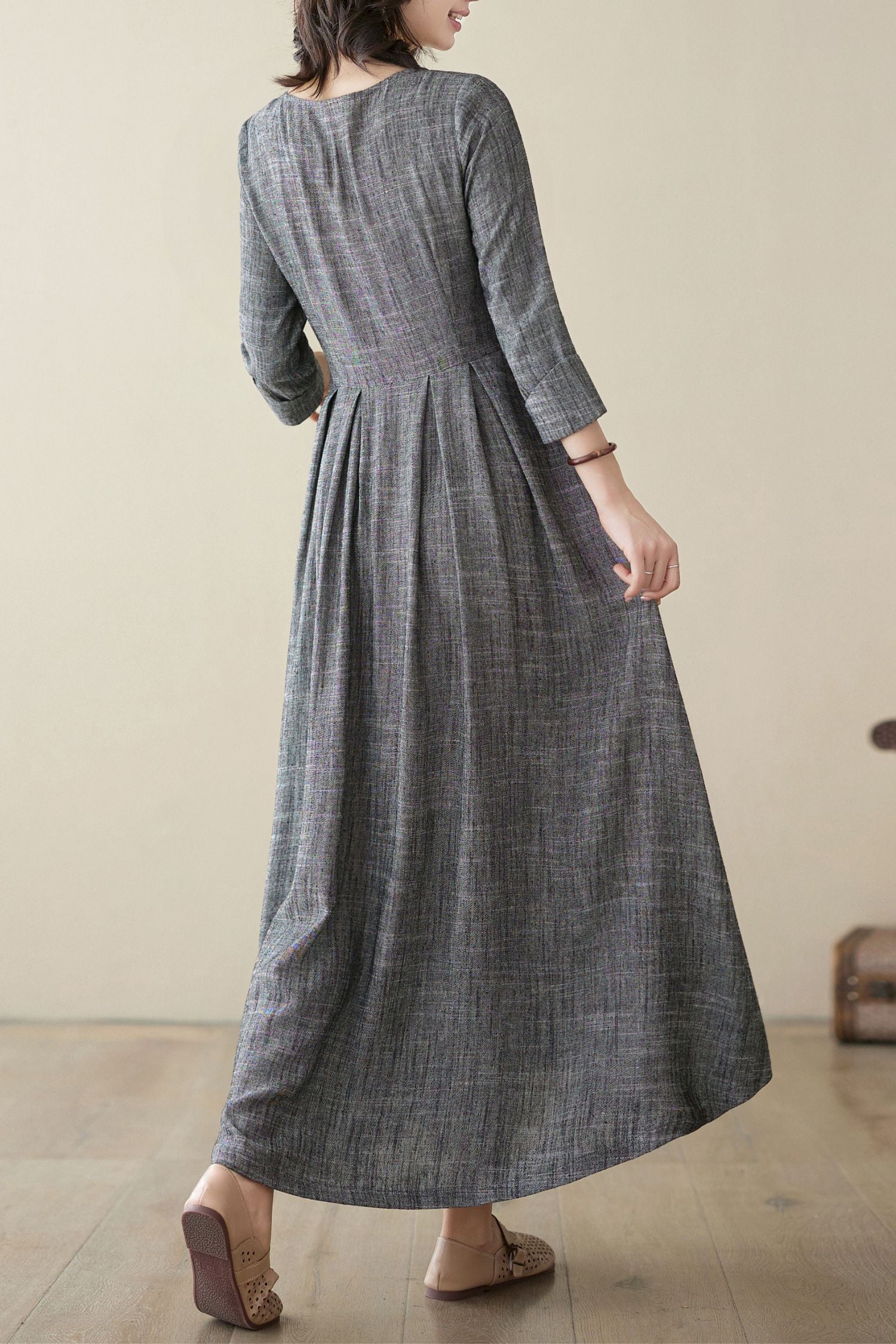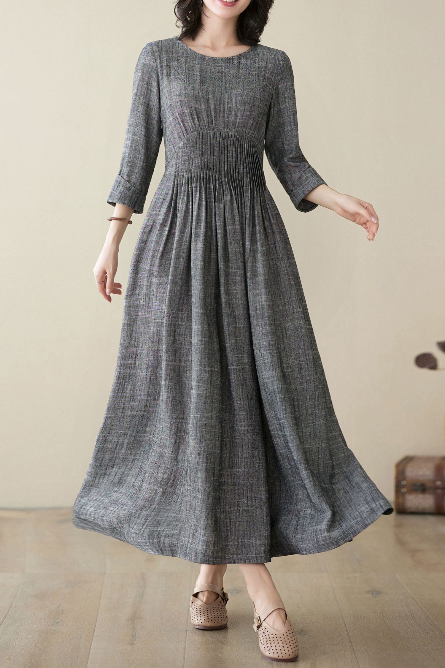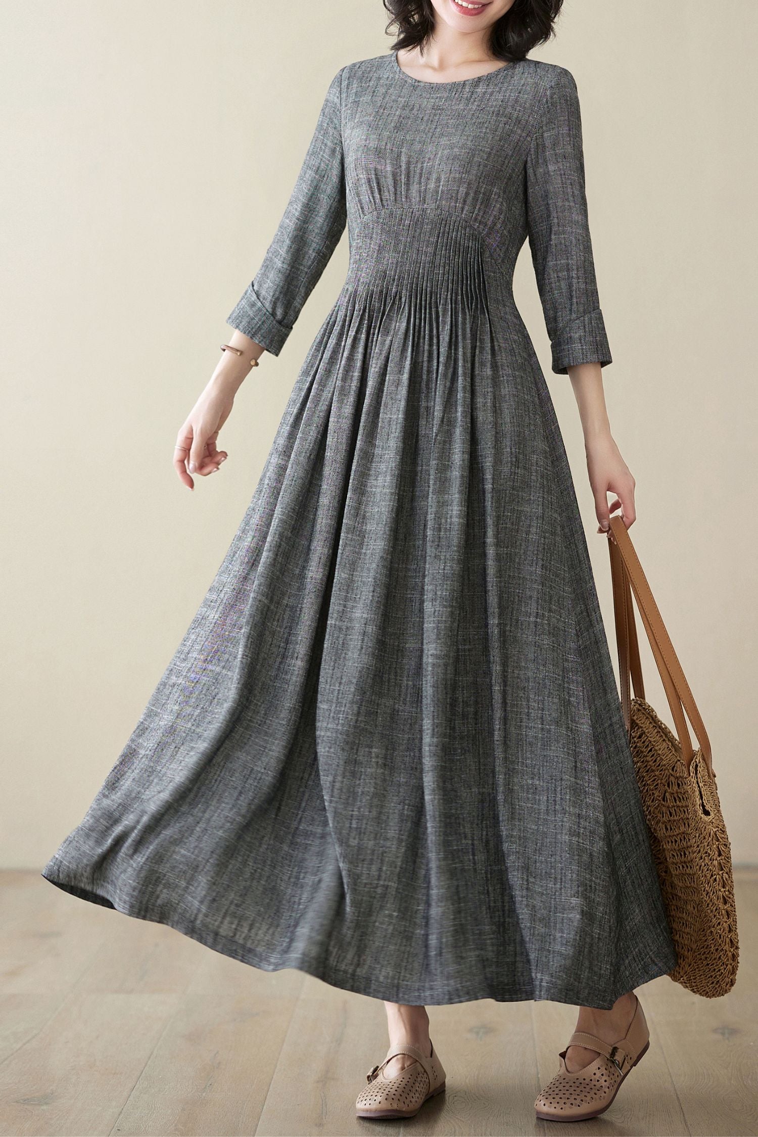 Elevate your spring and summer fashion with our Women's Casual Grey Linen Dress C3948. Designed with a pleated waist and swing silhouette, this maxi dress creates a flowy and elegant look. The luxurious linen fabric adds a touch of sophistication to your wardrobe. Experience effortless style and comfort with this must-have piece.