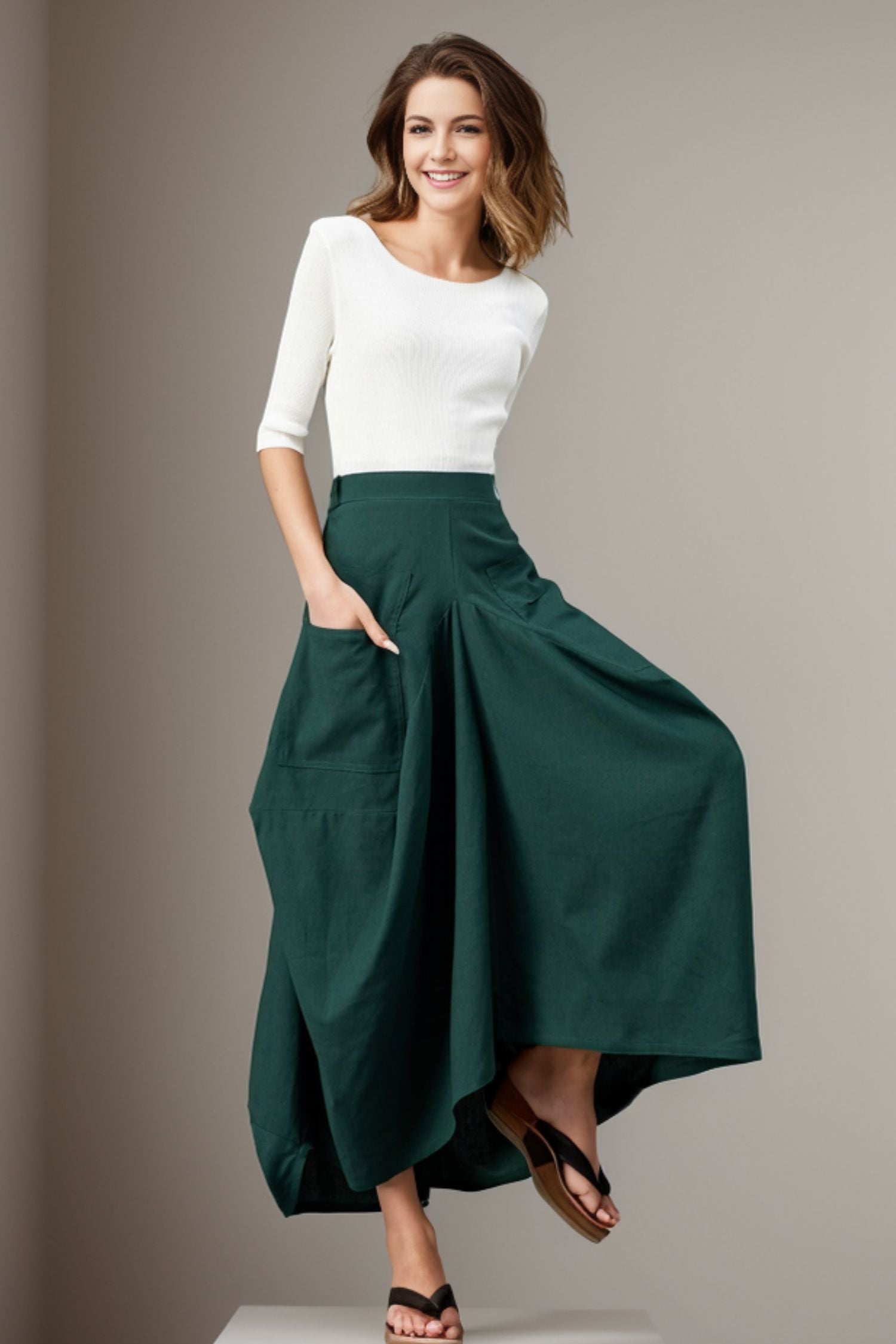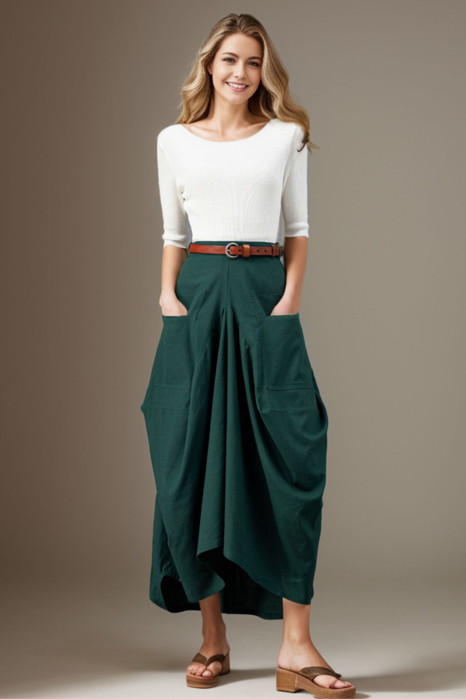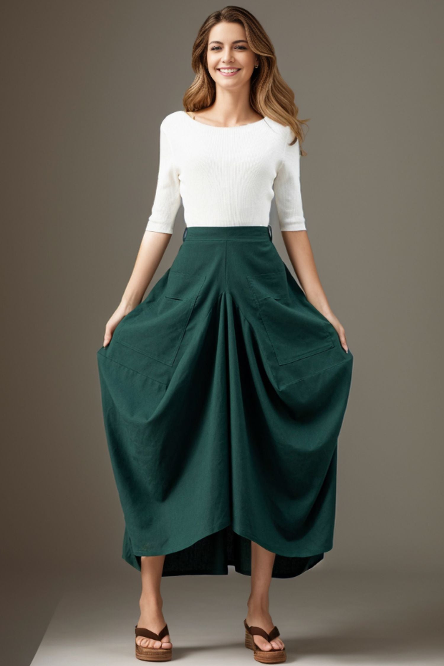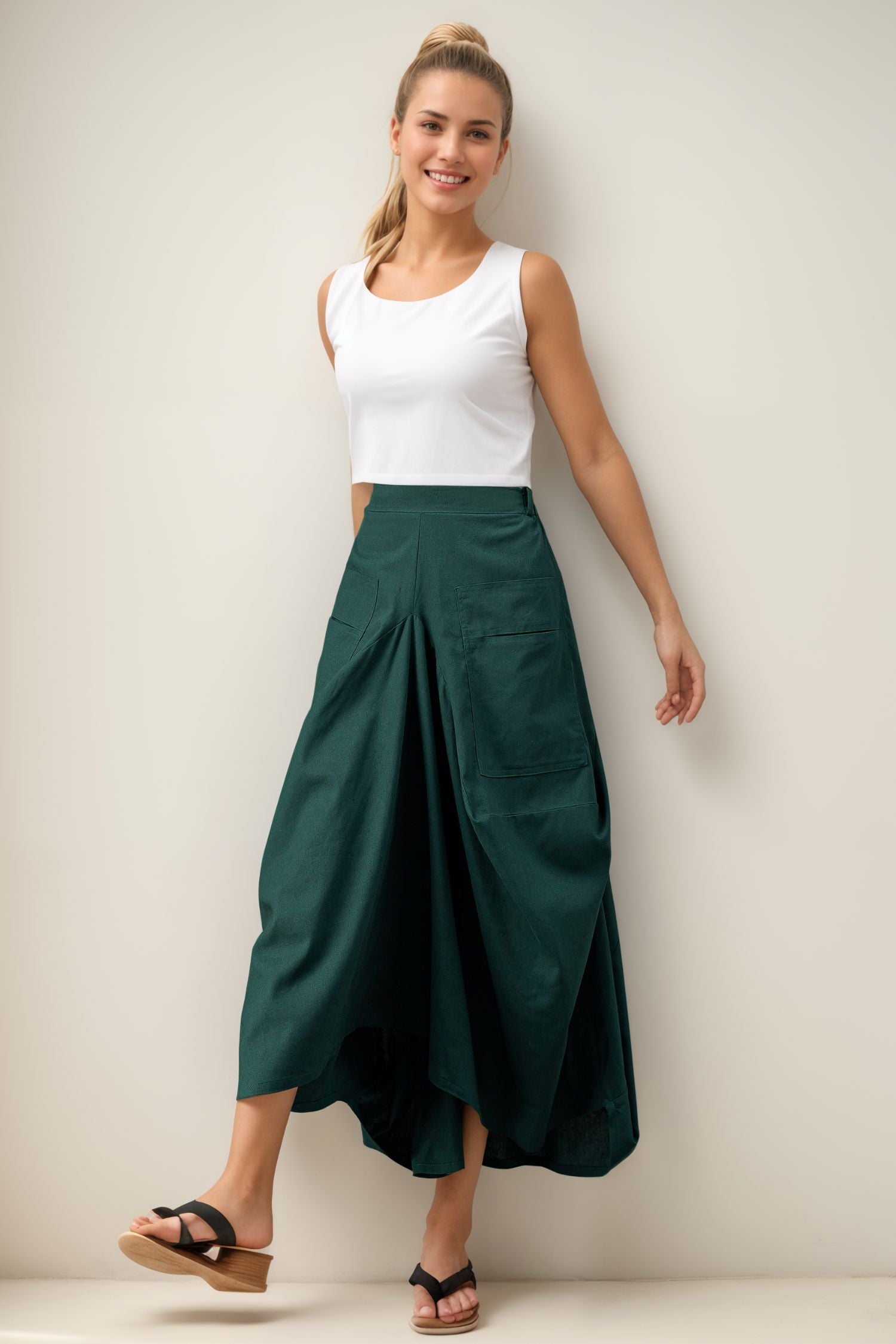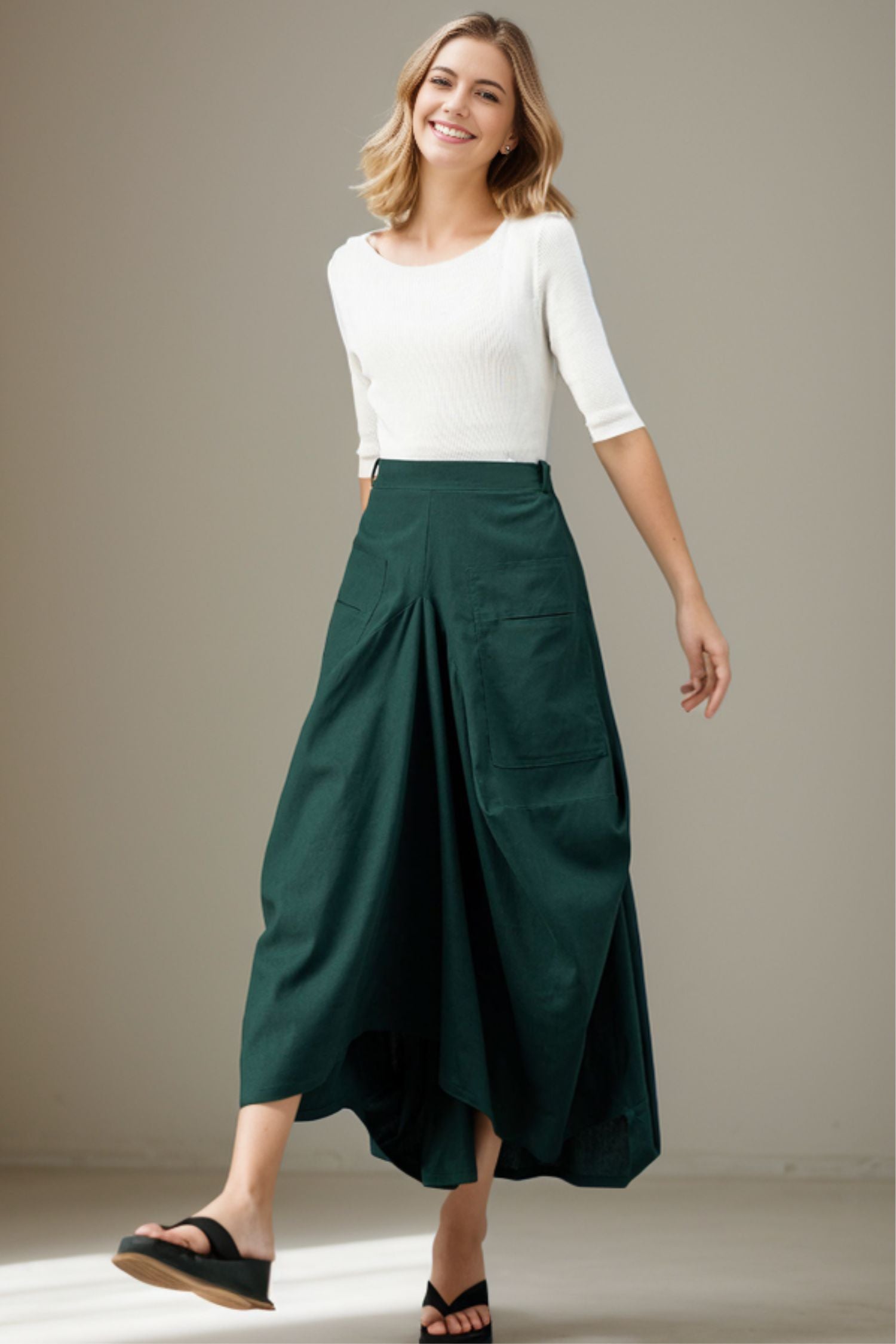 Introducing our luxurious Women's Green Asymmetrical Casual Linen Skirt. Made from high-quality linen, this skirt features a unique asymmetrical design that adds an avant-garde touch to your look. Perfect for any casual occasion, it offers both comfort and style. Elevate your wardrobe with this exclusive piece.