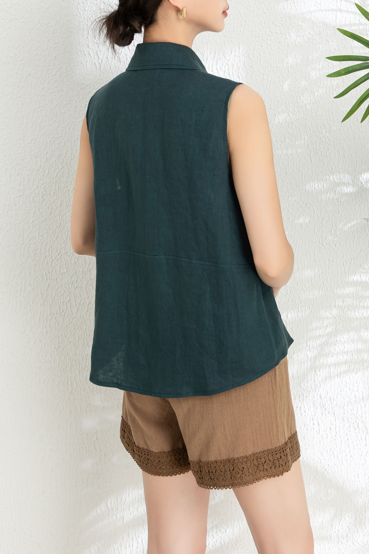 Elevate your summer wardrobe with our Women's Summer Sleeveless Linen Shirt. Crafted from dark green linen, this casual yet sophisticated top adds a touch of effortless chic to any outfit. The loose fit and custom design make it a versatile and luxurious addition to your collection.